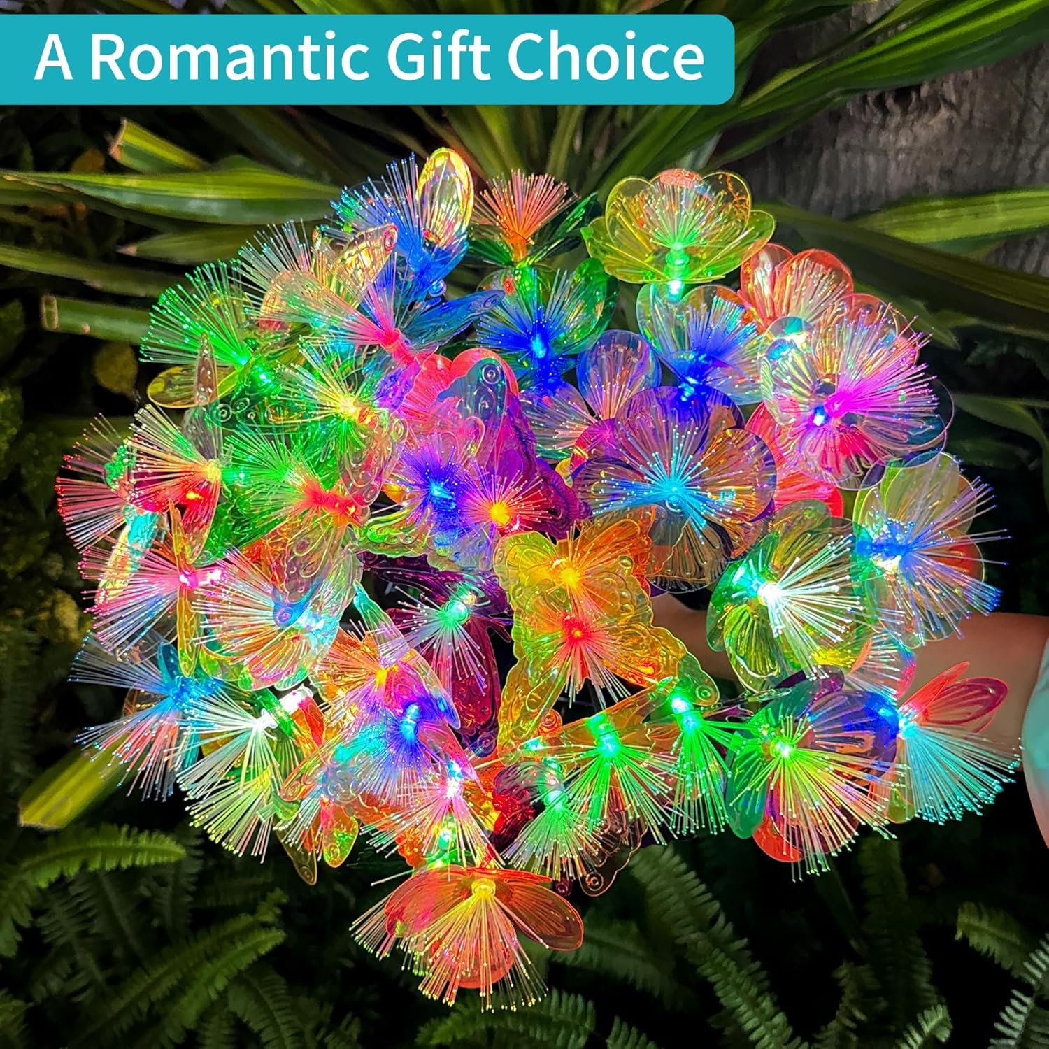 These solar flowers have a colorful metallic sheen in the daylight. They light up with color changing lights at night. They are a feast for the eyes.