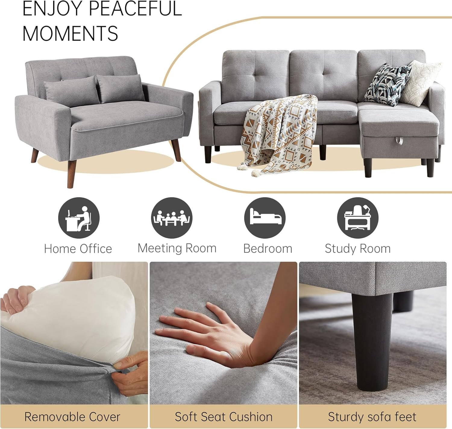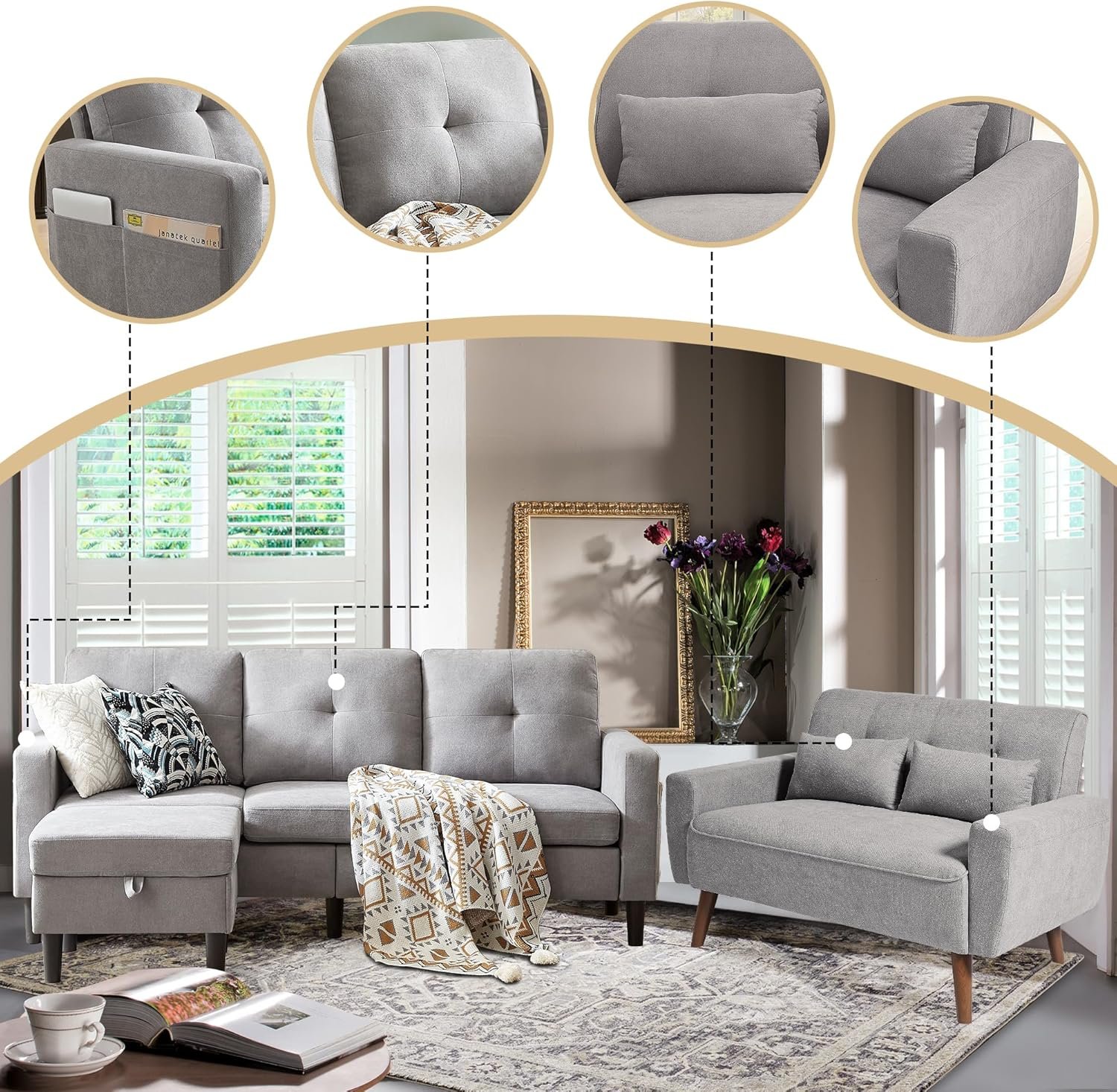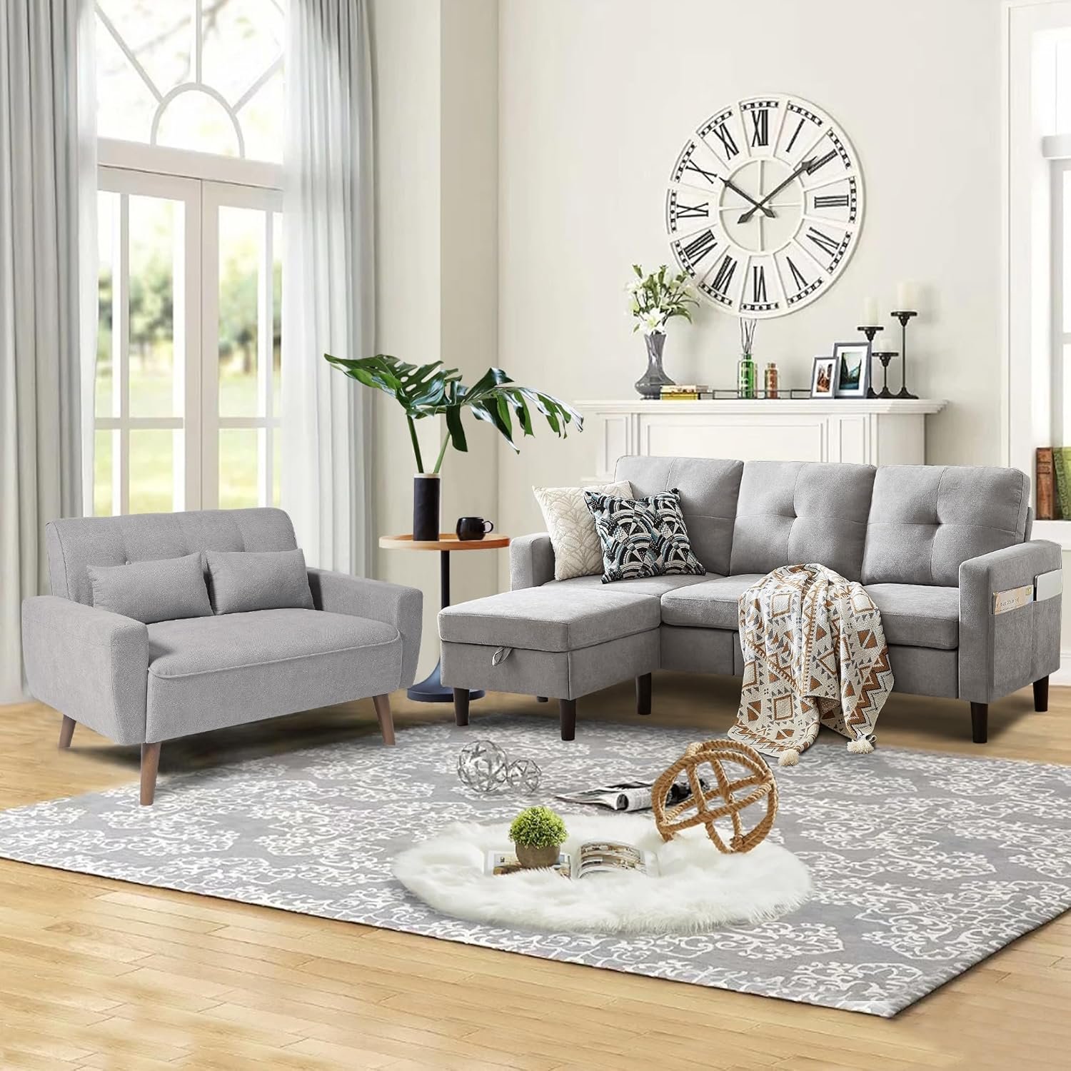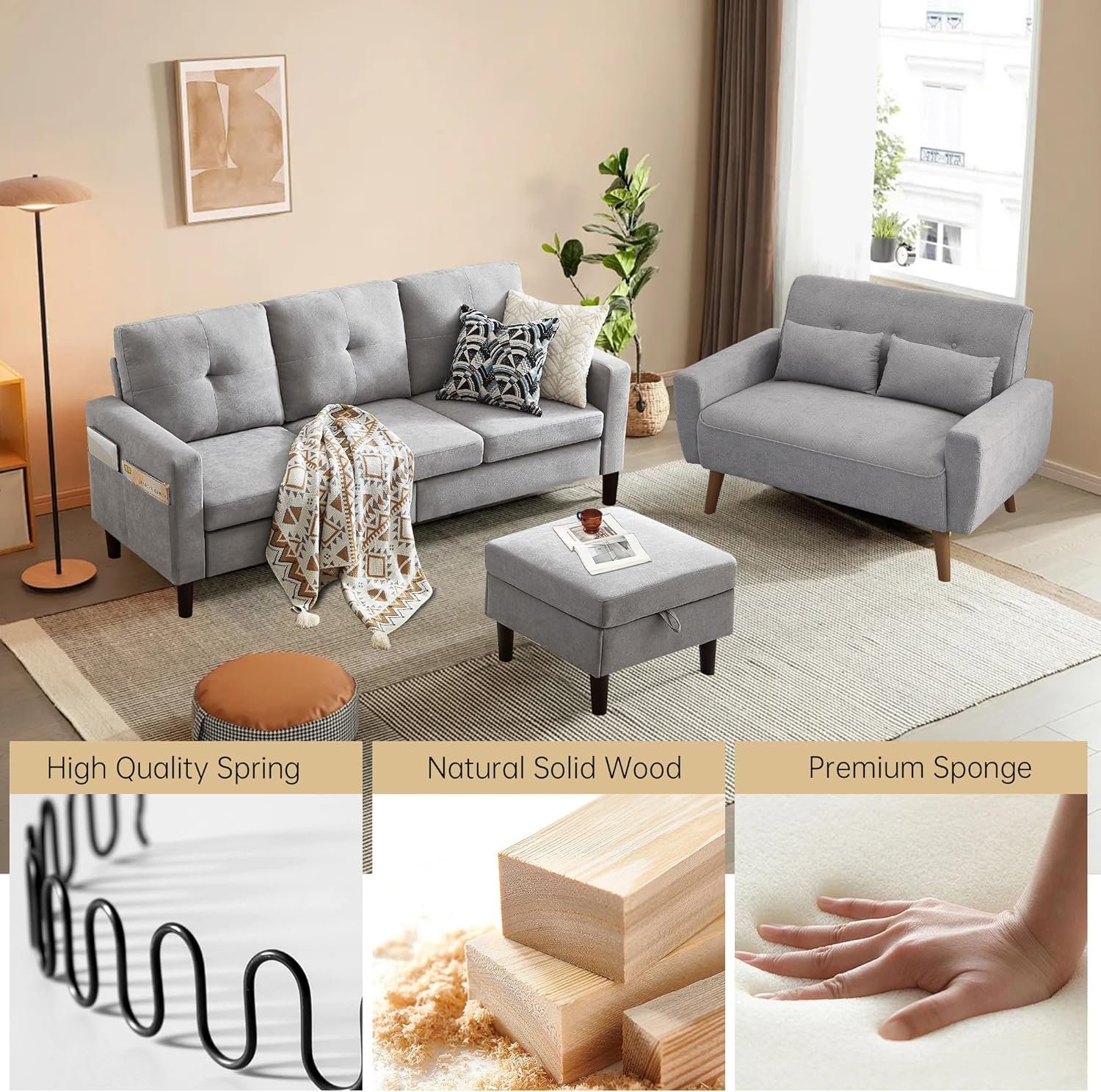 6 reviews for 2 Piece Comfy Couch Set, 3 Seater & 2-Seater Sofa and Loveseat Set with Ottoman, Modern Sofa Sets for Living Room/Apartment/Office, Light Grey
