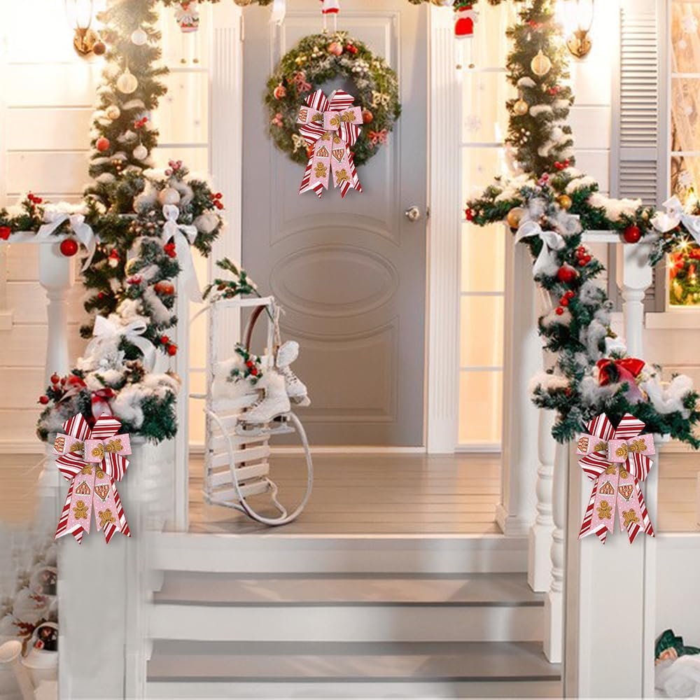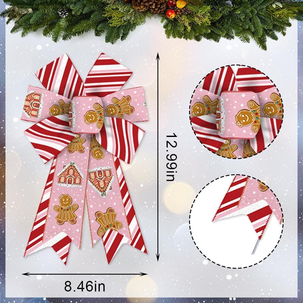 2pcs Christmas Wreath Bows, Pink Pingerbread Bows for Wreath Xmas Snow Bows for Front Door, White Pink Red Stripe Tree Bows for Winter Xmas Party Home Indoor Outdoor Decor