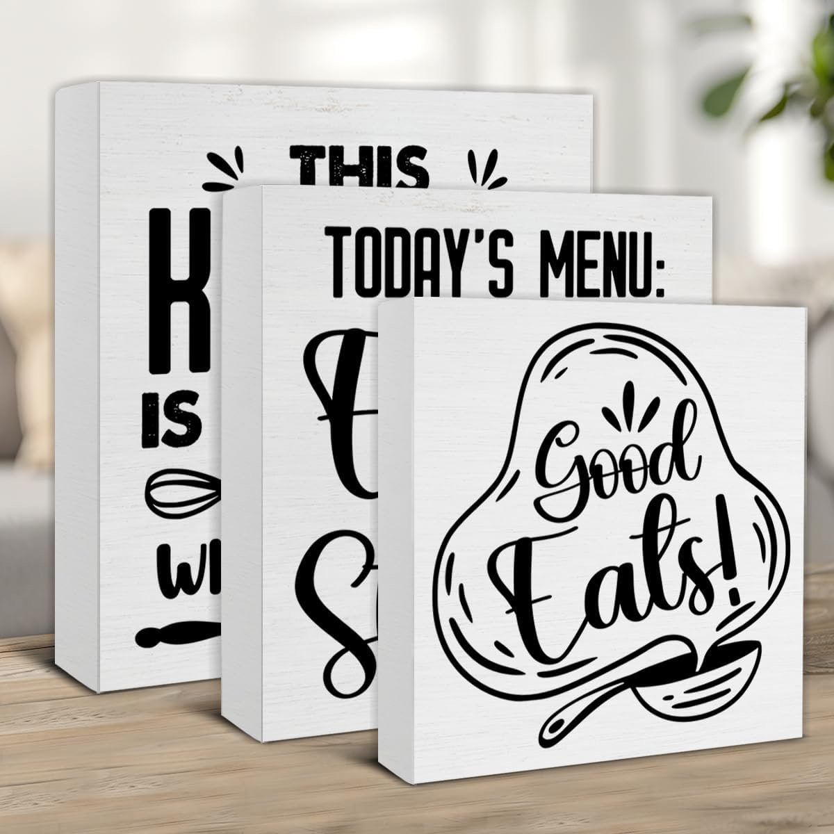 I like that these wooden signs can stand on their own. The black printed graphics stand out on the white background. The saying are fun to add to my kitchen decor.