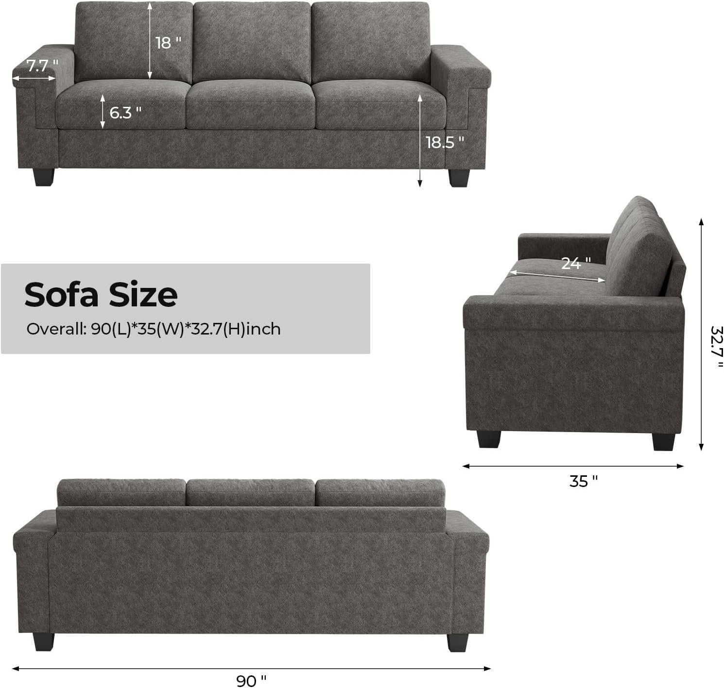 3 Seater Sofa Couch with Deep Seat, 90″ Modern Upholstered Sofa with Armrests, Easy Installation, Comfy Couches for Living Room, Apartment, Gray