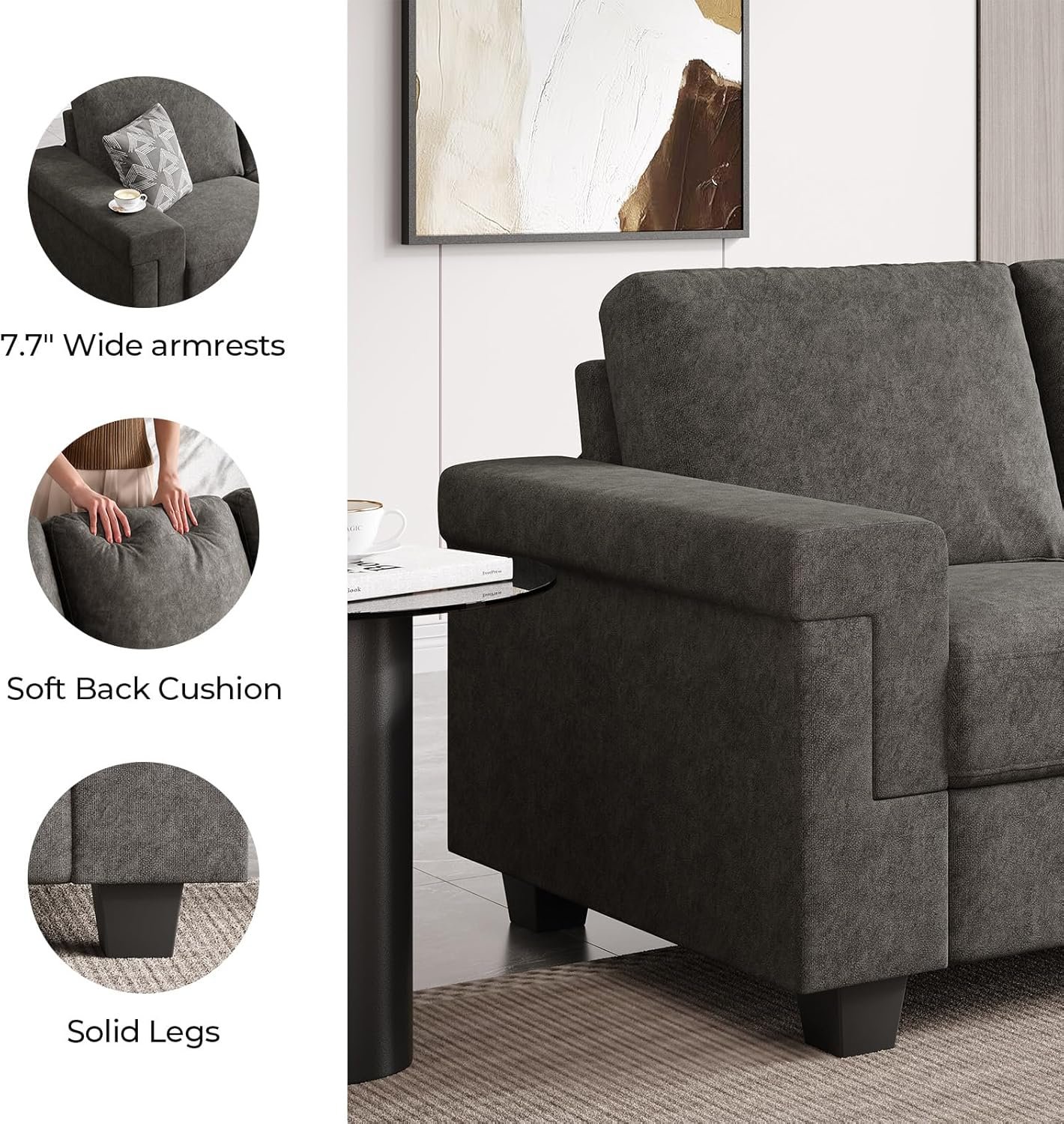 Great product, it was everything I expected. The couch legs are a bit short but I plan to switch them to 6 inches soon. The fabric is soft and of good quality. The couch is firm and comfy to sit on. The cushions came vacuum sealed so it needs time to fluff out but I think it looks great after assembly! If you’re on a budget and need a couch this is a solid option!