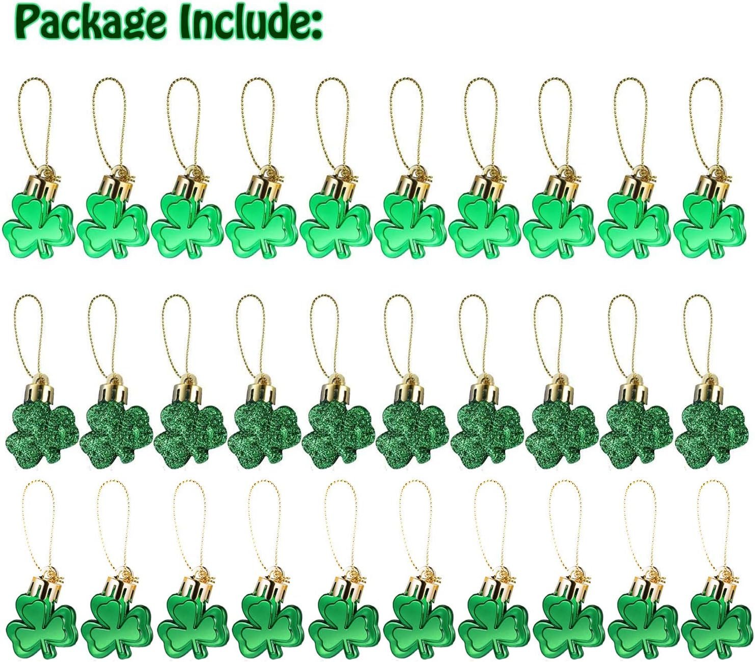 30 PCS St. Patrick’s Day Shamrocks Ornament Set, Good Luck Clover Hanging Bauble Trefoil Pendant Decoration for Keyring Tree Shelf Home Decor Irish Festival, 3 Style