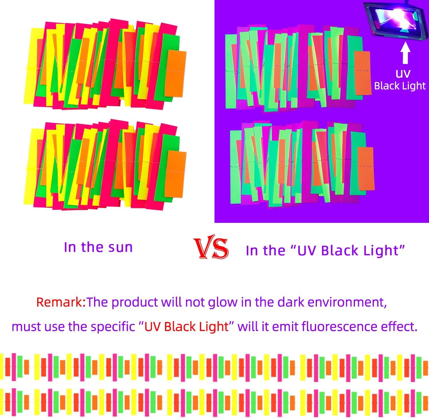 Used this as garland for my classroom blacklight party. It was so cute! The colors were so bright that they looked like they were actually lit up rather than just black light activated. I thought they would be one time use, but I was able to pack them up to use next year! I may buy more though!