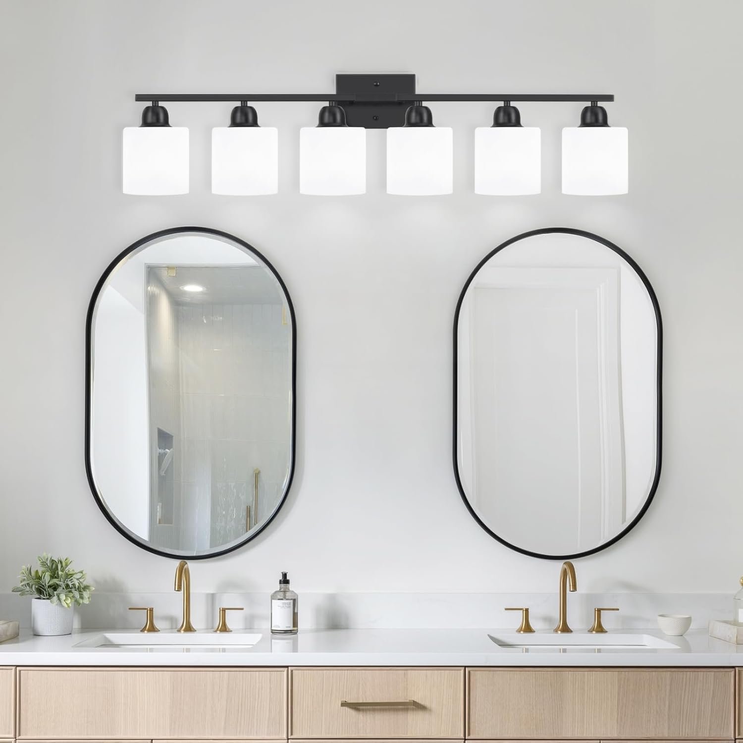 I was pleasantly surprised by how well this vanity light fixture balanced both form and function. I wanted something minimalist and modern, but not boring or flimsy – and this hit the mark. The black finish looks great even with the brushed nickel accents I already had in the powder room, and the milky white frosted glass shades diffuse light beautifully without any glare. What really impressed me, though, was the build quality. The fixture has a solid metal frame with two support bars that give it real stability unlike a previous vanity light I tried, which sagged under the weight of the shades. These shades are thick and sturdy. The whole unit has a nice weight to it, without being too heavy. Installation was quick and seamless, and everything we needed was included. All in all, it’s a simple, elegant fixture that feels far more durable than other lights in the same price range. Highly recommend.