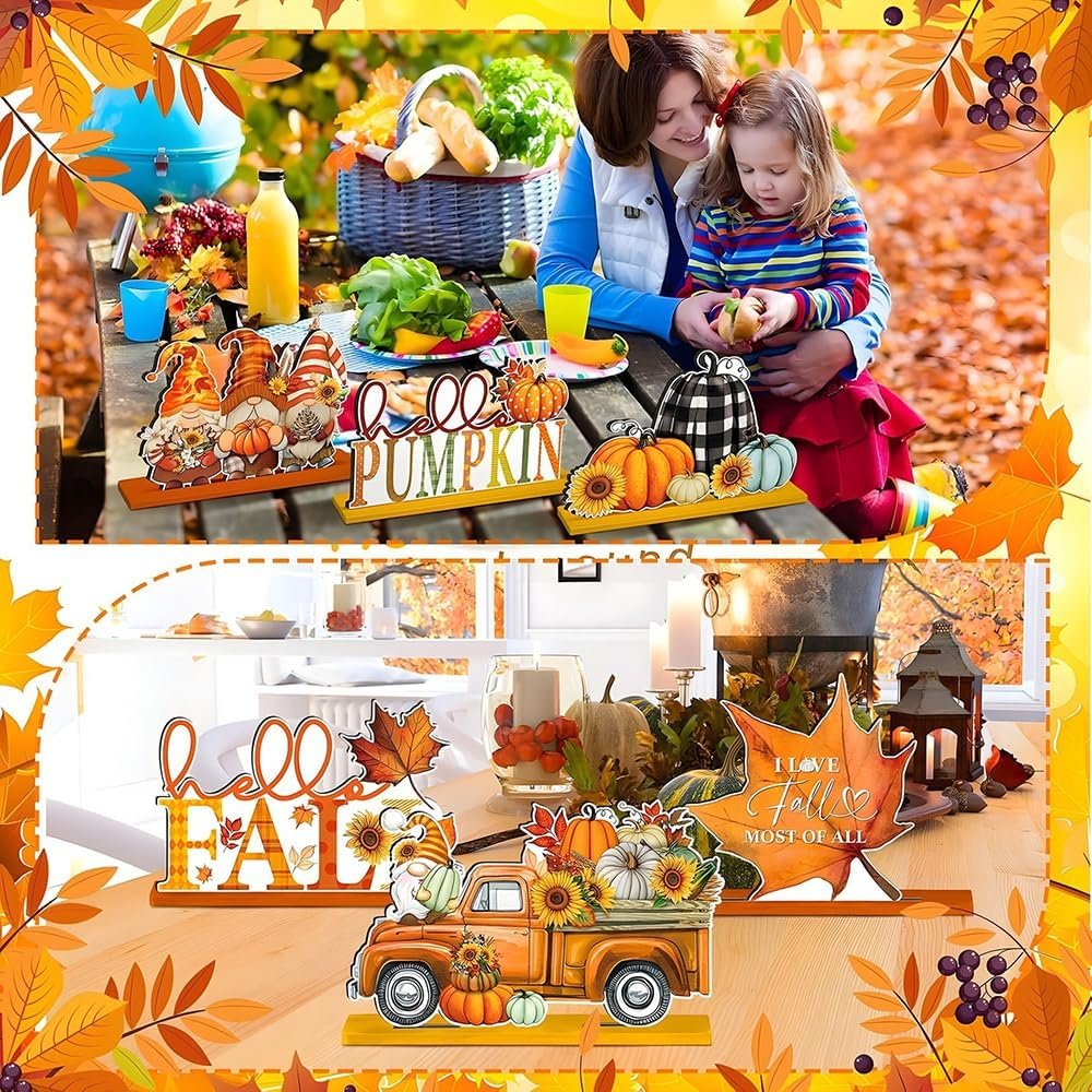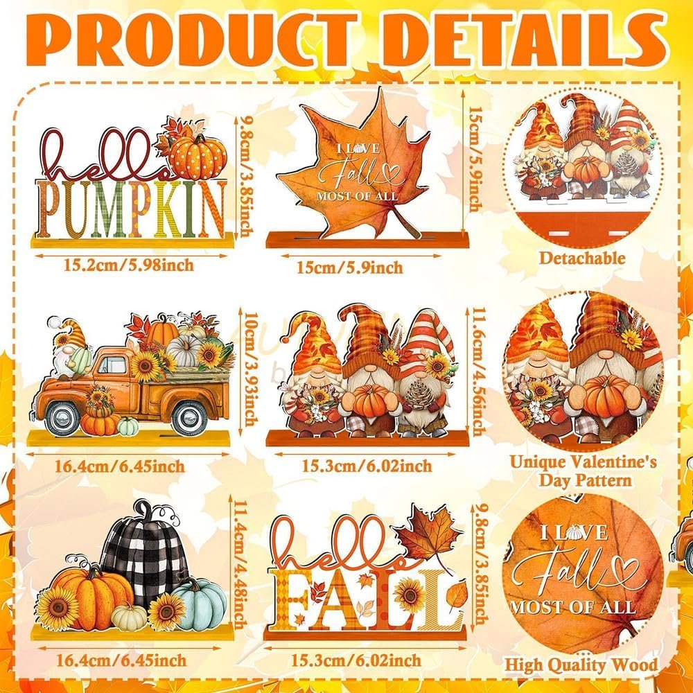 6 Pcs Fall Decor for Home Fall Thanksgiving Wooden Signs Pumpkin Maple Leaf Design Tabletop Sign for Autumn Harvest Rustic Farmhouse Indoor Shelf Tiered Tray Mantel Decorations