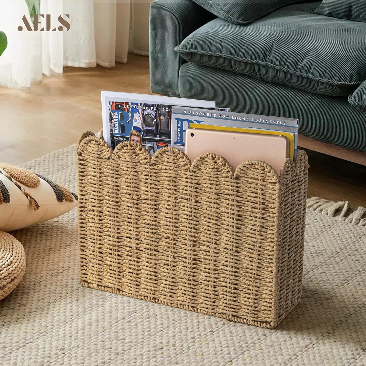 AELS Woven Natural Fibre Magazine Holder, Scalloped Edge Floor Magazine Rack, Hand-woven Organizer, Boho Modern Farmhouse Book Basket, File Newspaper Mail Holder for Office