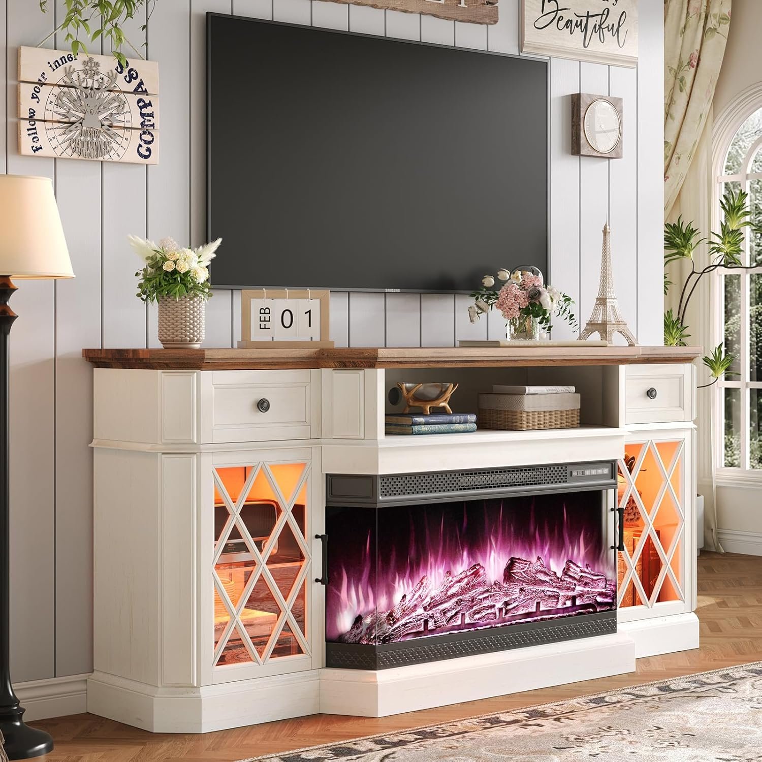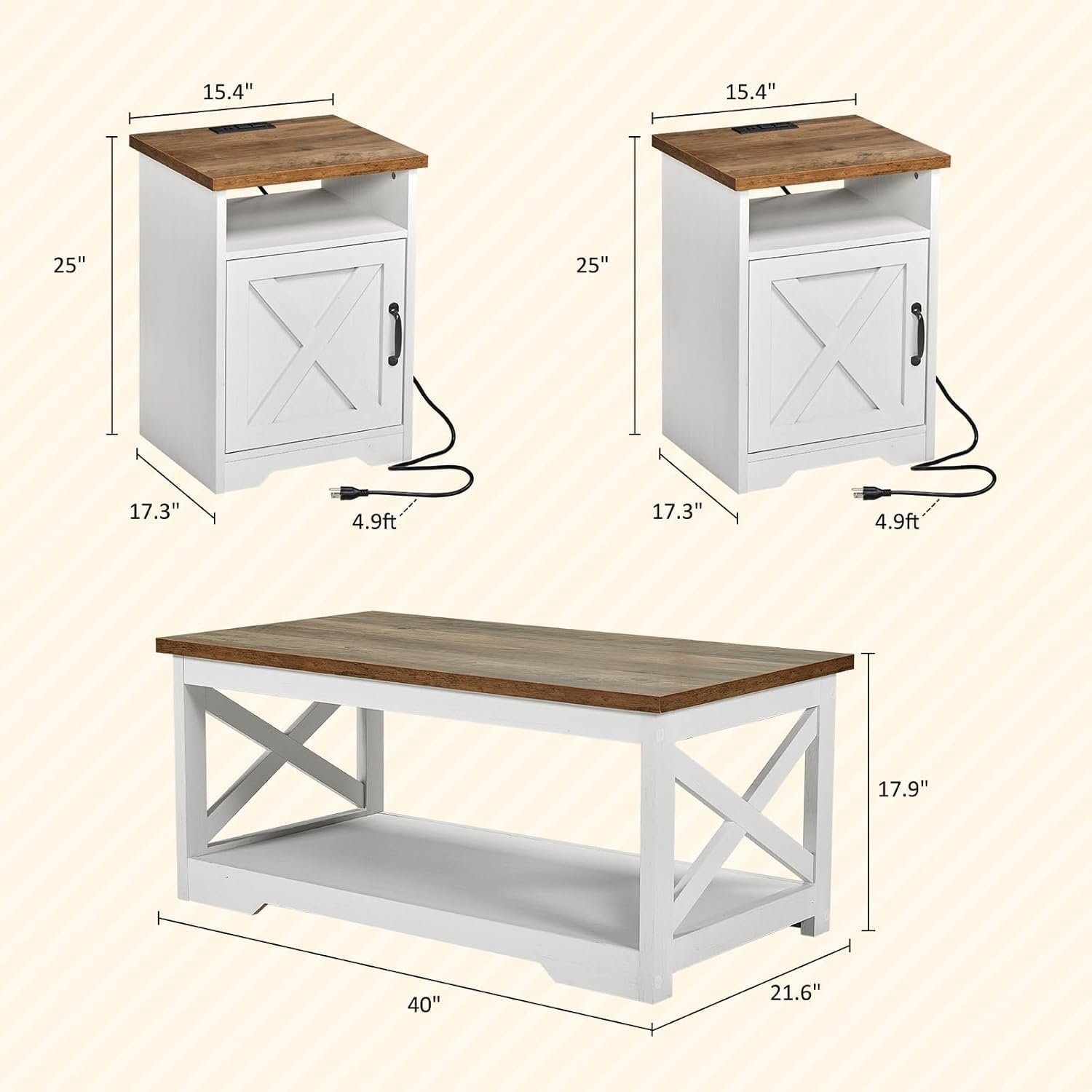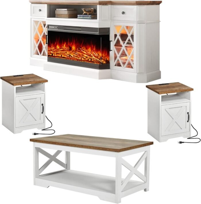 4 reviews for AMERLIFE 5-Piece Farmhouse Table Set Includes 70″ Rustic TV Stand with 36″ Glass Fireplace, 40″ Coffee Table, 2 End Tables with Charging Station, Living Room Table Sets/w Barn Door, Distressed White