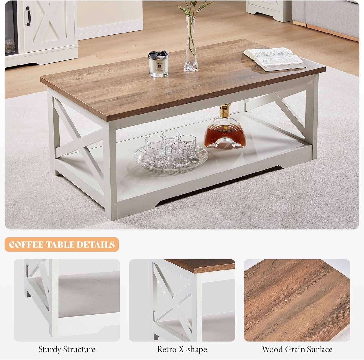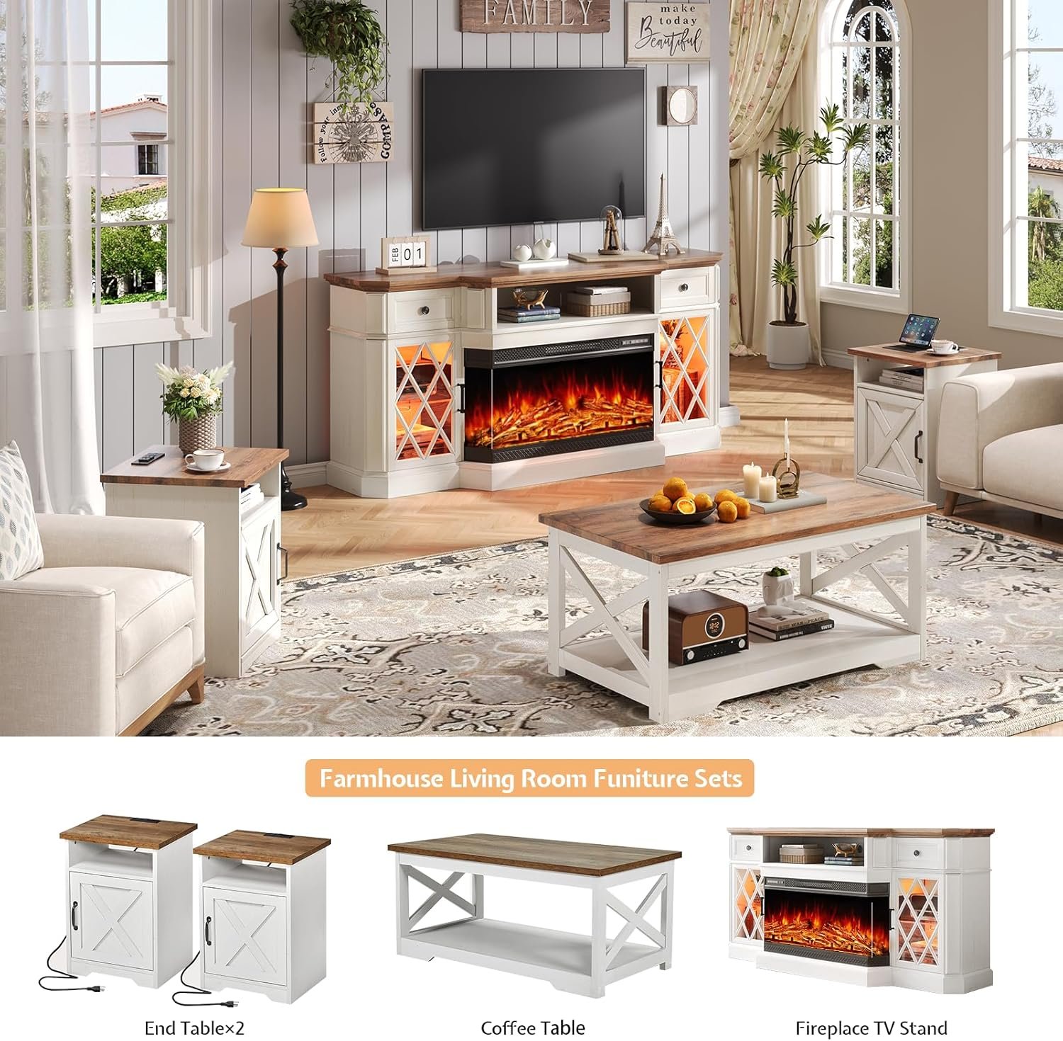 AMERLIFE 5-Piece Farmhouse Table Set Includes 70″ Rustic TV Stand with 36″ Glass Fireplace, 40″ Coffee Table, 2 End Tables with Charging Station, Living Room Table Sets/w Barn Door, Distressed White