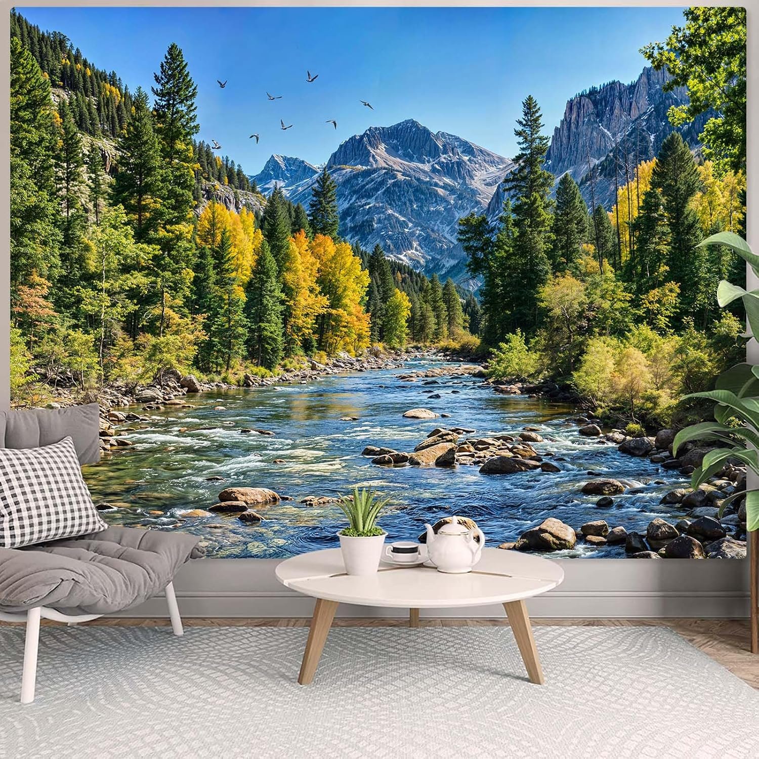 AMM Nature Forest Mountain Tapestry Green Pine Tree Tapestry for Bedroom Aesthetic Flowing River Landscape Tapestries Wall Hanging Bird Decor for Living Room Classroom Dorm Office
