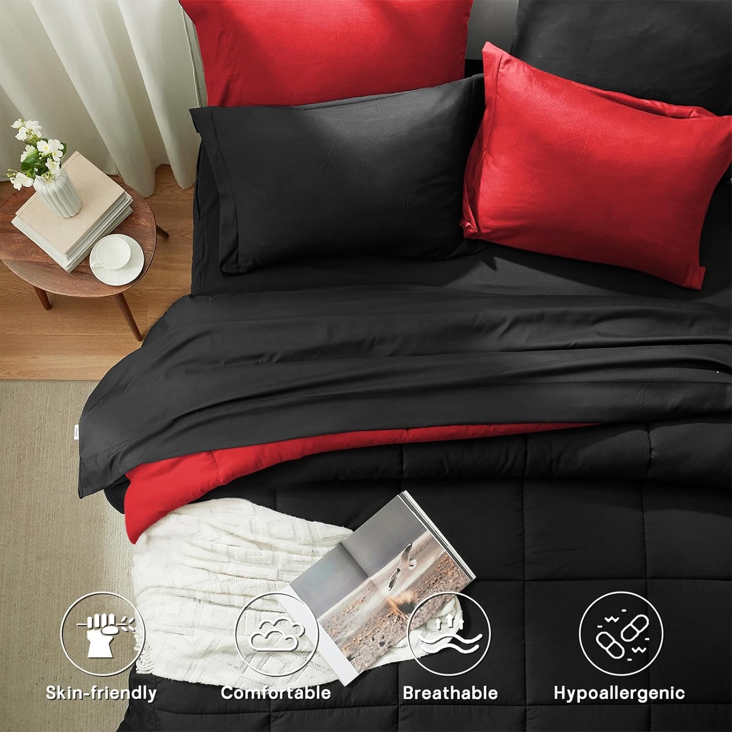 Anluoer Queen Comforter Set 7 Piece, Reversible Bed in a Bag Queen Size, Lightweight Bedding Set with 1 Comforter(88″*88″), 2 Pillow Shams, 2 Pillowcases, 1 Flat Sheet, 1 Fitted Sheet, Red & Black