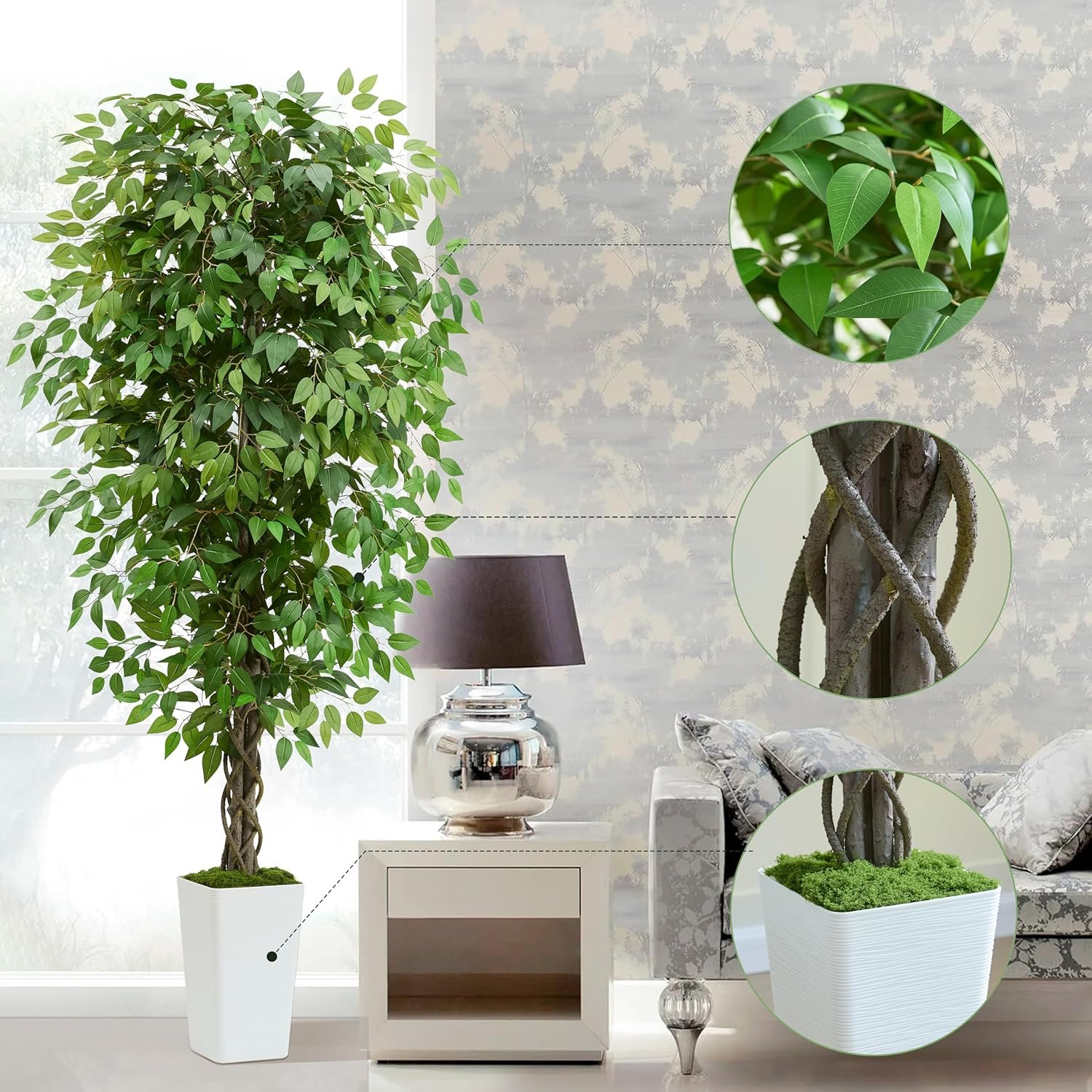 Artificial Ficus Tree 6FT Faux Plants Indoor Tall Fake Plants with White Planter, Green Lifelike Lush Fake Ficus Tree for Home Living Room Bedroom Outdoor Balcony House Office Decor