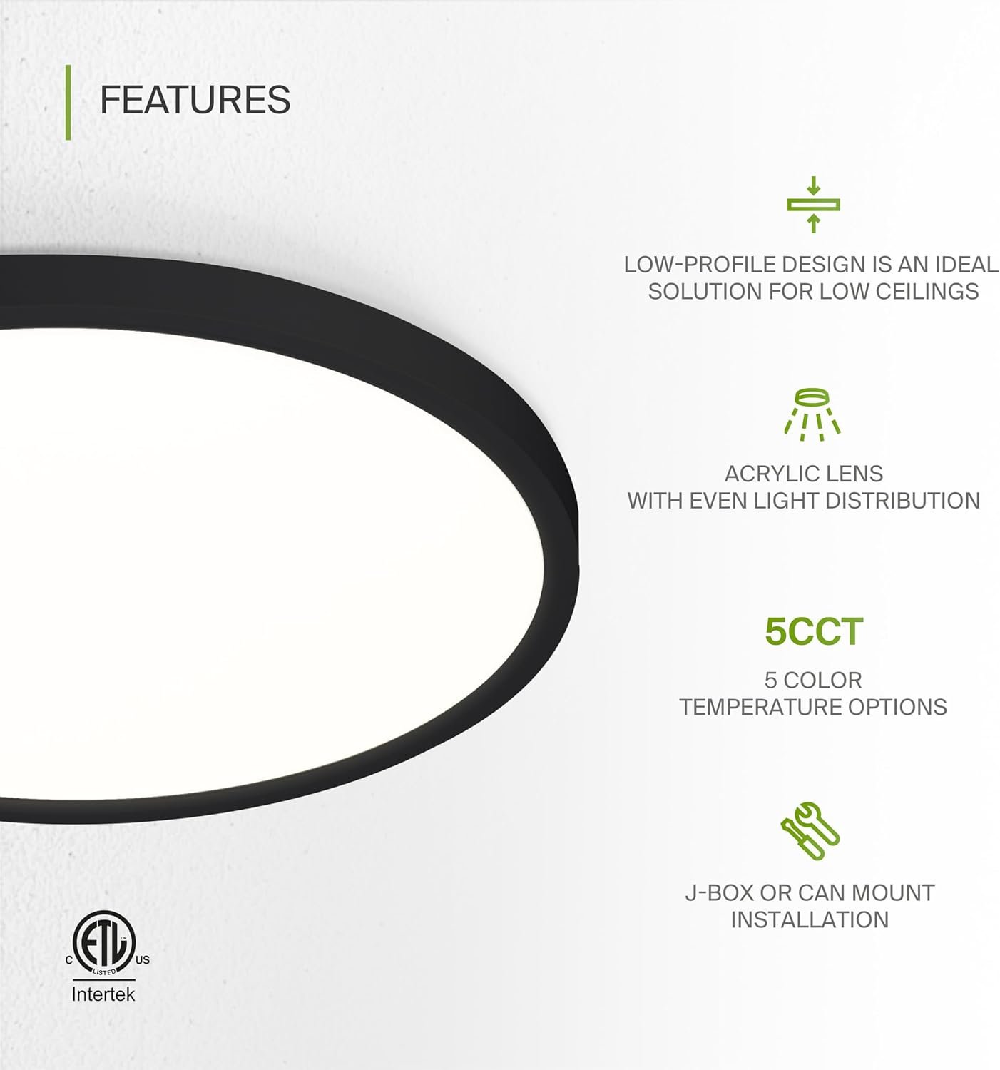 ASD LED 12″ Round Flush Mount Ceiling Light Fixture, Low Profile Surface Lighting | 5CCT, Dimmable, Ultra-Thin, ETL Listed | 24W 1900LM 2700-6000K 120V | Kitchen, Hallway Lamp | Black, 12 Pack