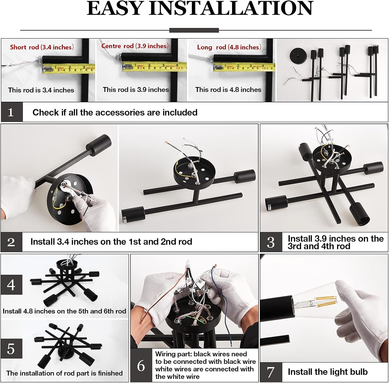 I like this fixture very much, but there are 6 bulbs, with 6 separate live and 6 separate neutral wires, and it only came with very small wire nuts. Pray tell me how you are supposed to fit 7 (6+1) wires in a small wire nut?!Would recommend but you need to play around to get it to work, and you need your own large wire nuts.