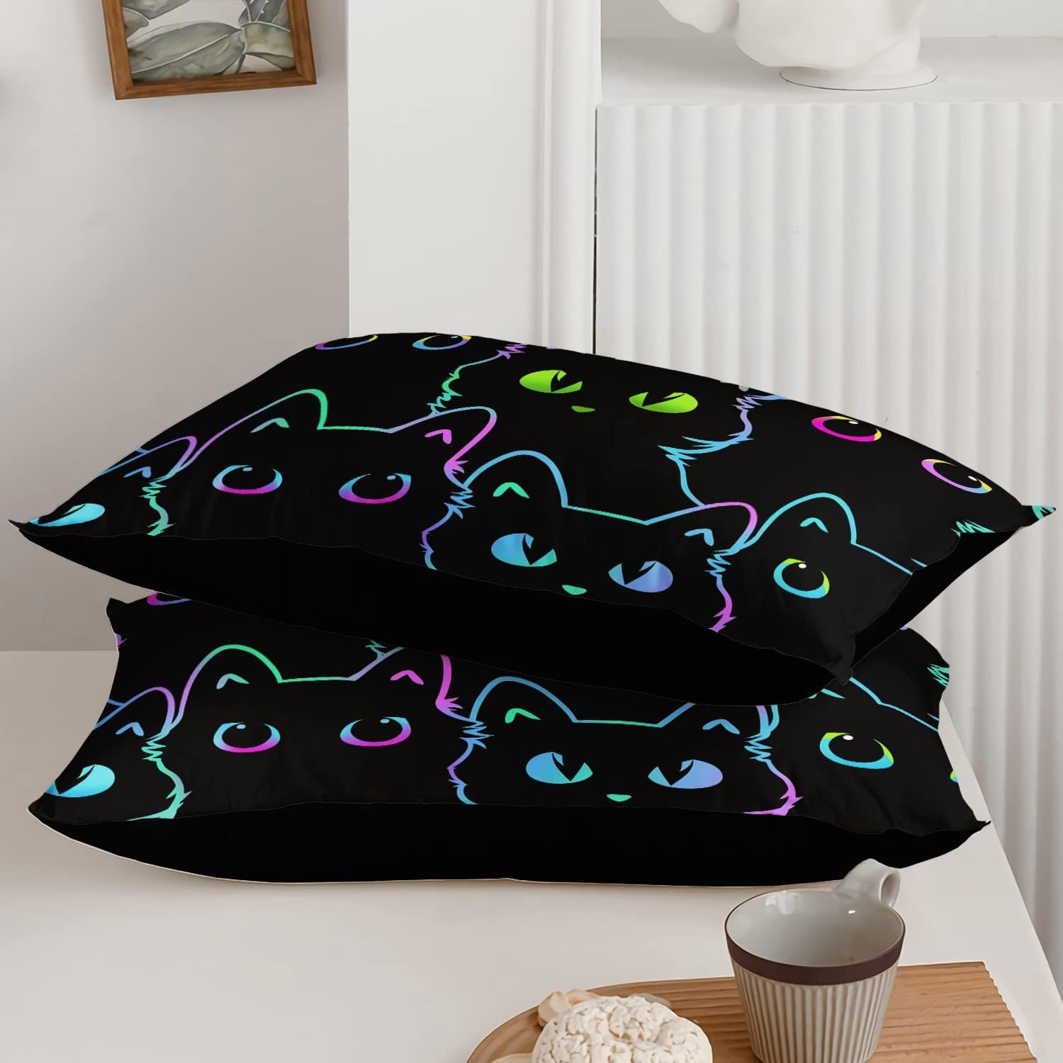 I got the twin version with the neon outlines of cats walking, sleeping & just catting. The reverse side is plain black, but it has the same type of material as the front. The printed side is beautiful and just like the picture. The fabric is lovely; it doesn’t have that slick, cheesy polyester feel to it at all. Instead, the comforter’s material has a sturdy feel without being nubby or dense, if that makes sense. I was surprised by how lightweight the comforter is and worried that it wouldn’t keep me warm. However, paired with a simple microfiber top sheet, it’s utterly cosy. Now, I live just outside of Oakland, California, and I have never experienced temperatures in the low 30s or less here. That being said, I also don’t have a working furnace. My house is slightly warmer than the outside temperatures, since there are humans and cats walking around, I have curtains at all the windows that are closed at night and, of course, there is no wind. Still, it does get chilly (thank heaven for throws and fuzzy hoodies😁). Nevertheless, once my body heat has warmed the sheet and comforter, I am toasty all night (you know, those initial few seconds when you get under the sheets at night that you crave during the summer, but which is brutal during winter). I haven’t woken up feeling cold. I’m not entirely sure how the comforter will do when we experience our few days of cold in the high 30s, but if I add my lightweight fleece blanket, I think I will have no problems. The only negative I have is the twin seems a bit narrow, but assuming a cat doesn’t lie down with me before I have centered it over my body, it hasn’t been a major issue. It more affects falling asleep rather than staying asleep. Oh, yes, I probably should disclose that I subscribe to the cat warming program where one or more cats lies around you at night, sometimes on top of the bedding and sometimes under it. While that could affect the reliability of my report of the cosy warmth from the comforter, I have tried to take this service into account for this review. 🐱🙄😁
