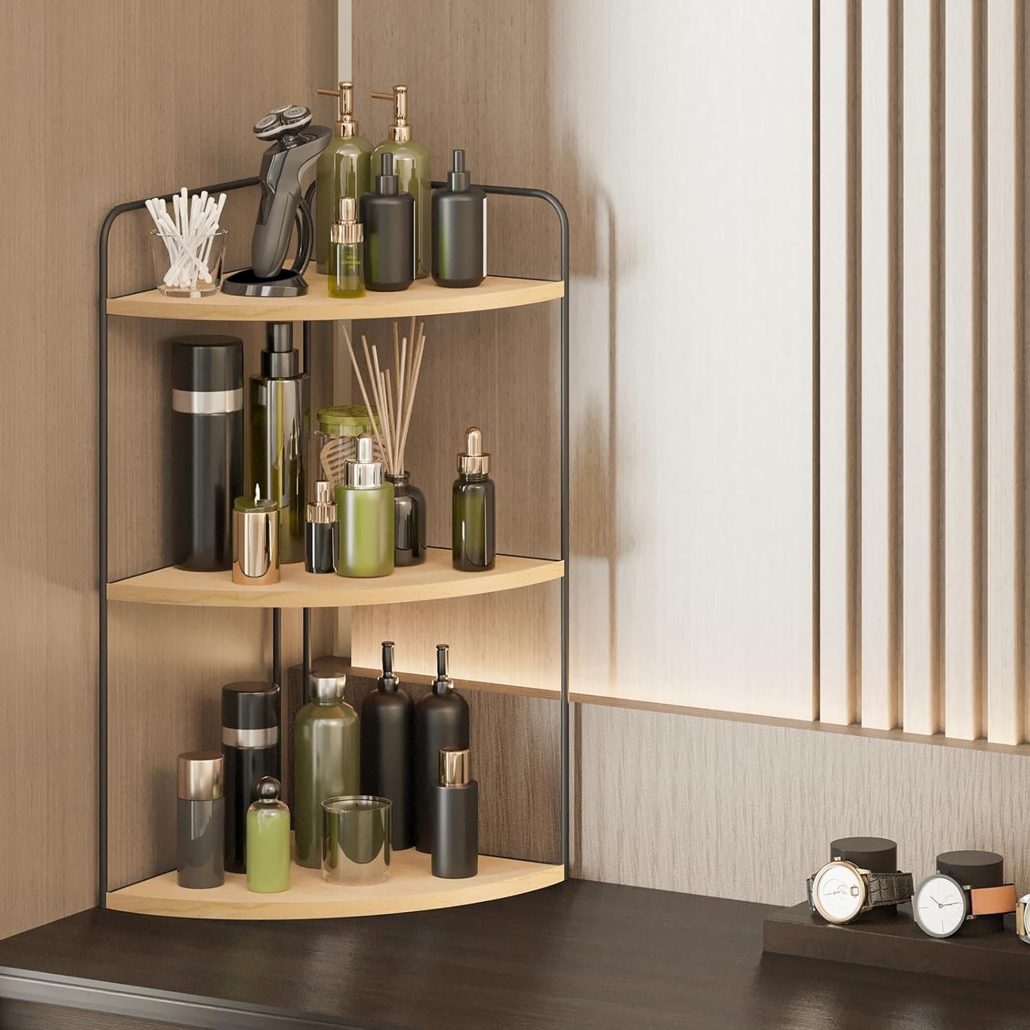 This bathroom counter organizer exceeded my expectations! The black iron frame and wood shelf add a sleek, elegant touch to my space. It was super easy to assemble and fits perfectly in the corner of my vanity. I love how much storage it offers without taking up too much room. It holds everything from soap to skincare neatly. A practical yet stylish upgrade—definitely recommend for small spaces!