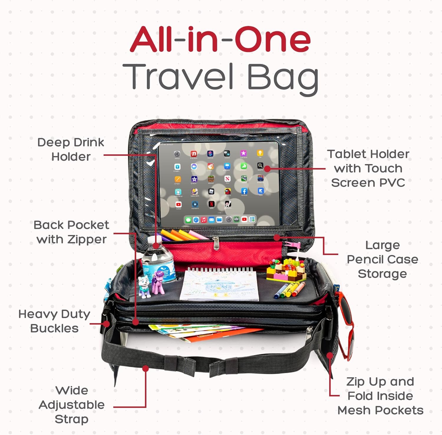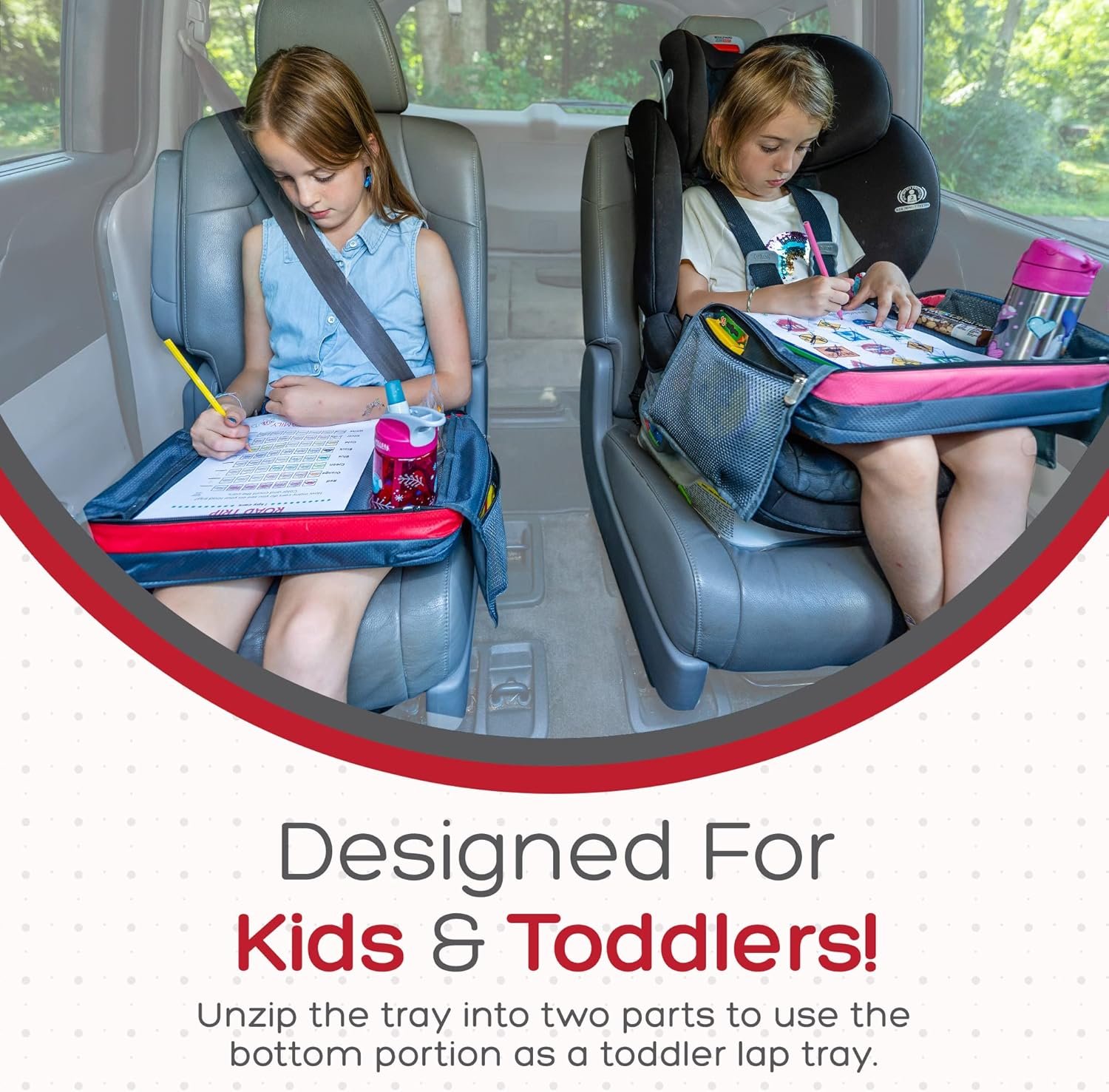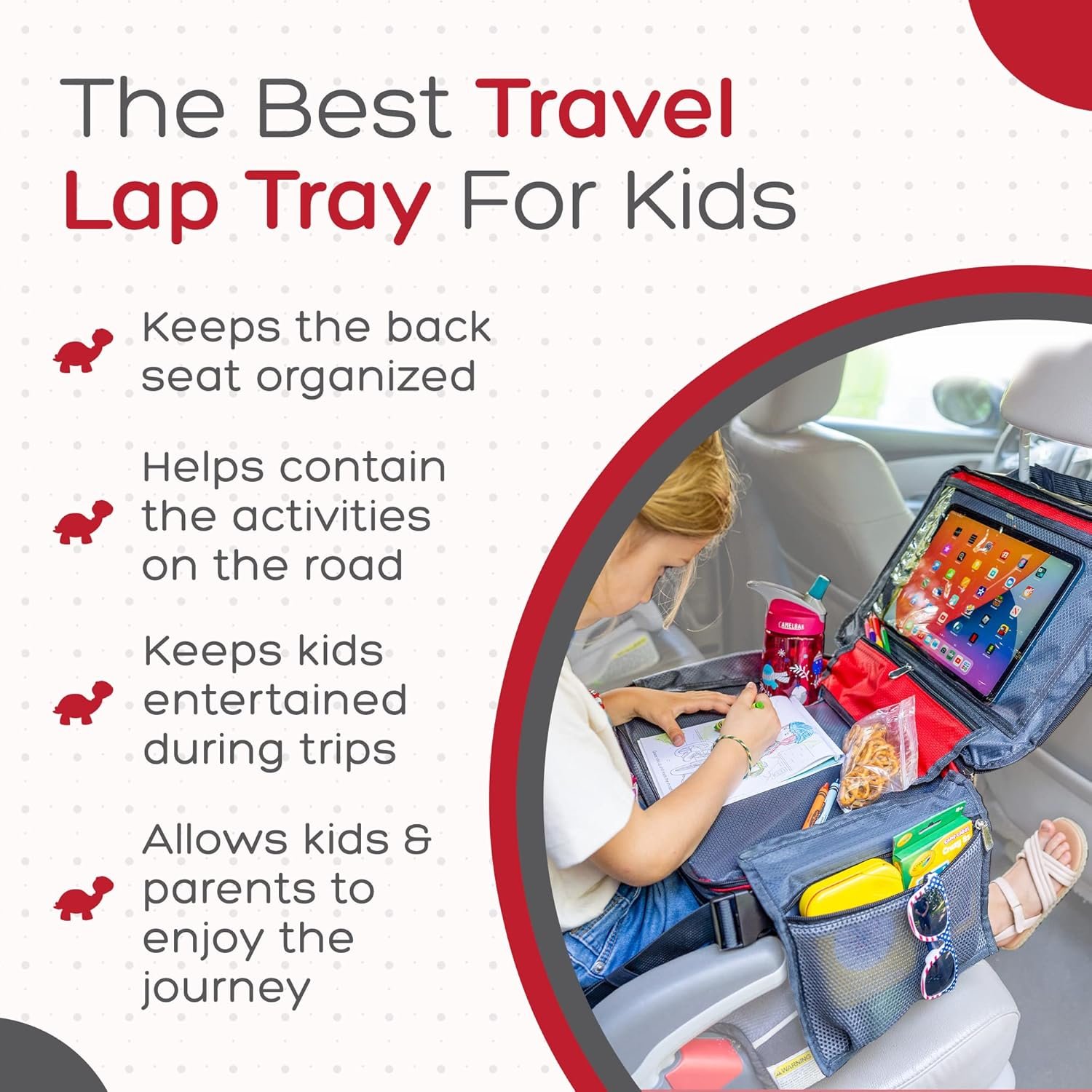 BE Family Travel Kids Car Seat Travel Tray, Car Accessories for Children, Car Seat Snack Tray, Traveling Essentials for Kids, Toddler Lap Tray for Engaging Activities, Multipurpose Design, Red