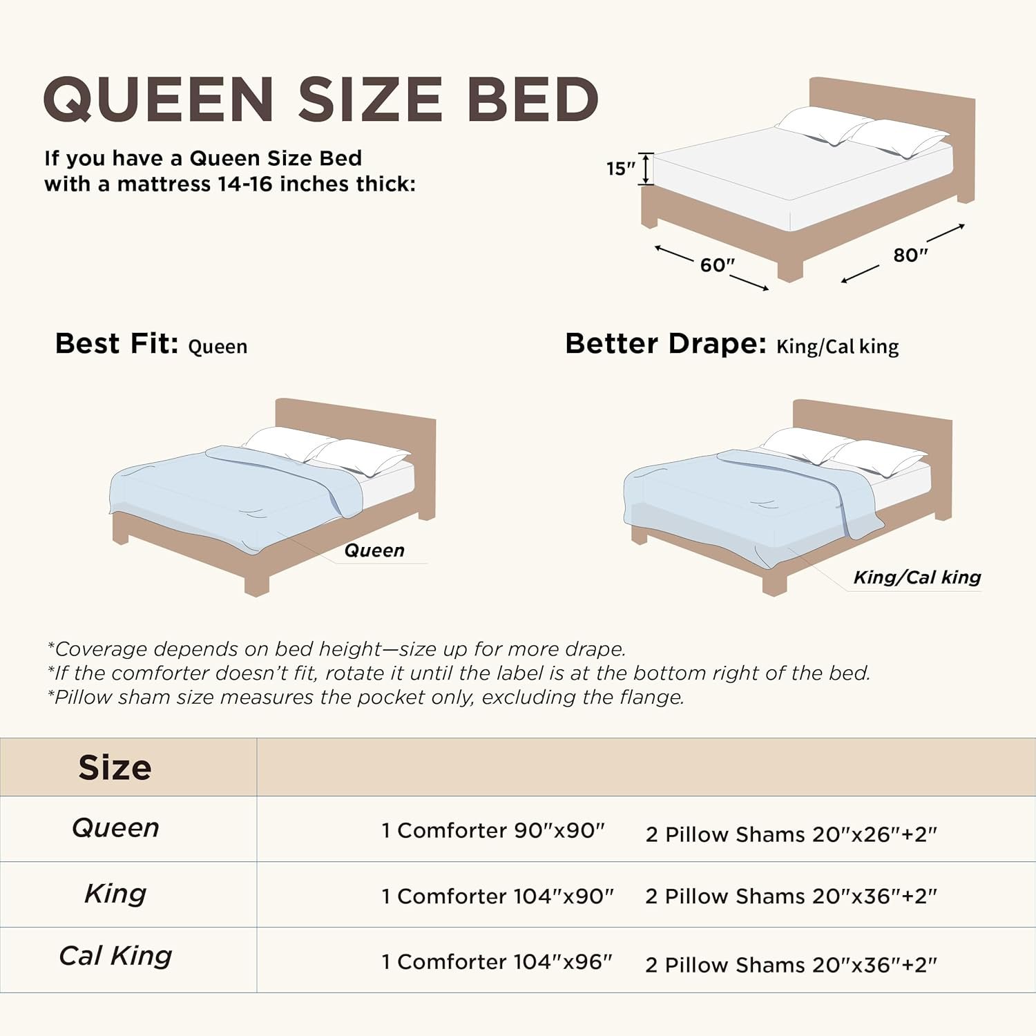 Fits perfectly on my Queen-size bed. I love it!. The color is true white, and the design looks elegant. The comforter is wrinkle-free, not too thick, not too thin, and feels very cozy. I highly recommend.