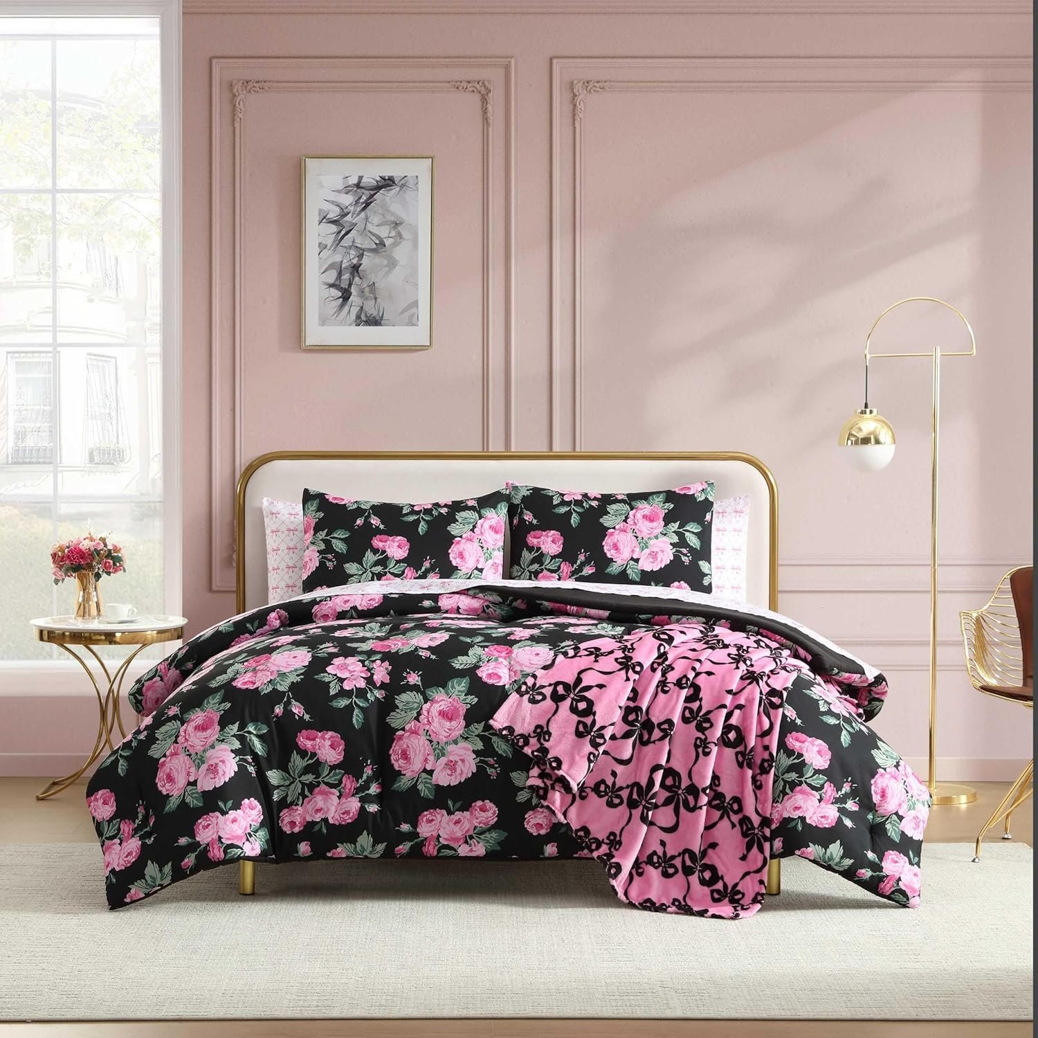 Betsey Johnson – King Bedding Set, Wrinkle-Resistant 8 Piece Bed Set, Ultra-Soft Comforter w/Matching Bed Sheets, Pillowcases & Throw Blanket, Lightweight for All-Season Comfort (Garden Floral Pink)