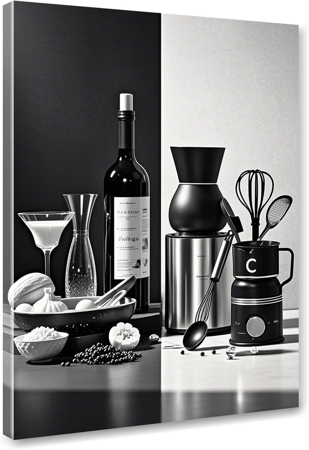 Black and White Kitchen Canvas Wall Art Dining Room Wall Decor Wine Bottle Seasoning Spoon Kitchen Picture Poster Prints Artwork Painting Dining Room Restaurant Bar Home Decorations 12×16 Inch Framed