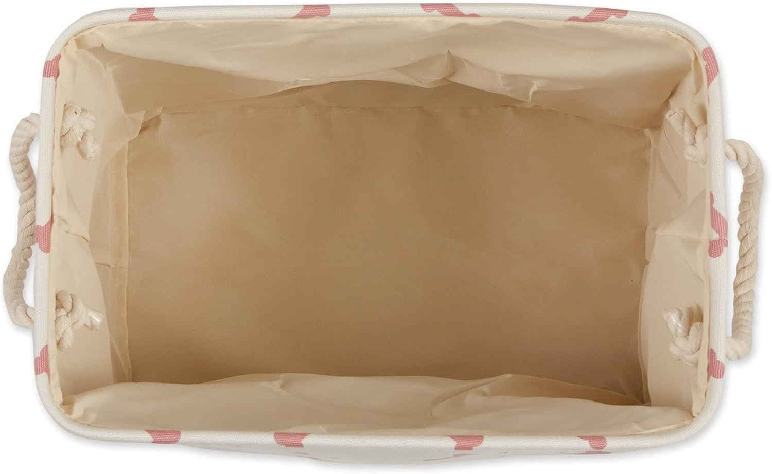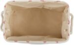 Nice heavyweight thick canvas material with sturdy handles – has worn very well – no signs of thinning or fraying. The print is cute and works well with the rest of my room decor. Just the right size to hold all their toys, but short enough that they can get into it all on their own. They love to make their own choices and scatter toys. Now if I could just teach them to clean up!