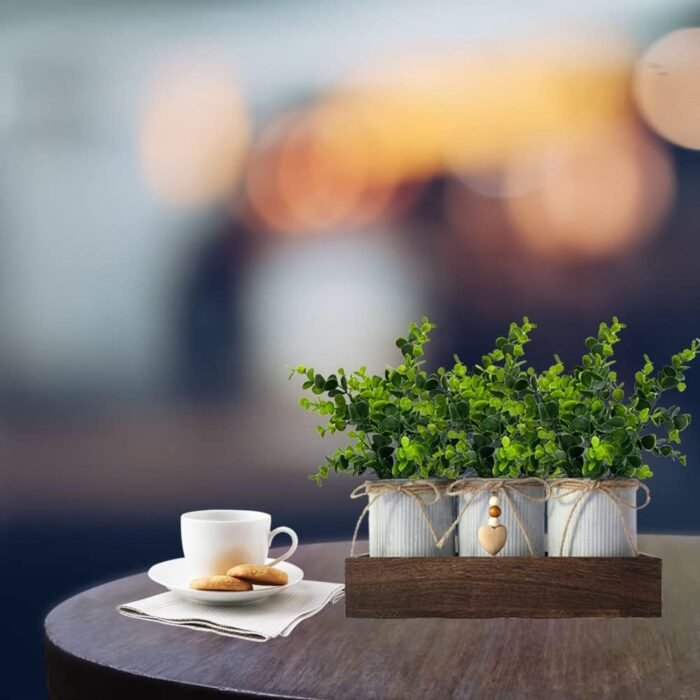 8 reviews for CALAVAK Decorative Centerpiece Wooden Tray with 3 Metal Potted Artificial Eucalyptus Rustic Country Home Décor for Dining Room, Living Room and Kitchen Table