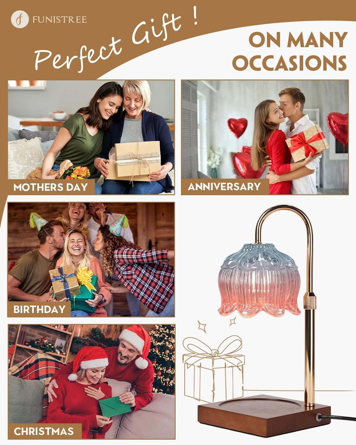 This is a really cute item that adds charm to a room, allows you to enjoy a scented candle without lighting it, and is dimmable with 1, 2, and 4 hour auto shut off function. It allows you to enjoy a candle without having to worry about the flame. The arm of the lamp is adjustable to fit small or large candles. The dimmable feature allows you to apply more heat for larger candles. It also acts as a small lamp to provide light at the desk or accent table it is on.The lamp is very fashionable; the adjustable arm is gold while the lamp and base are white. The lamp is packaged with 2 35 watt bulbs that are effective in melting wax candles.Overall, this lamp is worth considering as it allows you to enjoy scented candles safely, while also acting as a accent light for the room.