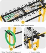 Multi-functional floor stand tools organizer can stores 4 brooms and 20+ yard, farm, lawn tools with 2 of baskets for smaller accessories, with plumbing, wire storage. And the bottom shelf can store boxes, buckets, showerheads and other tools.