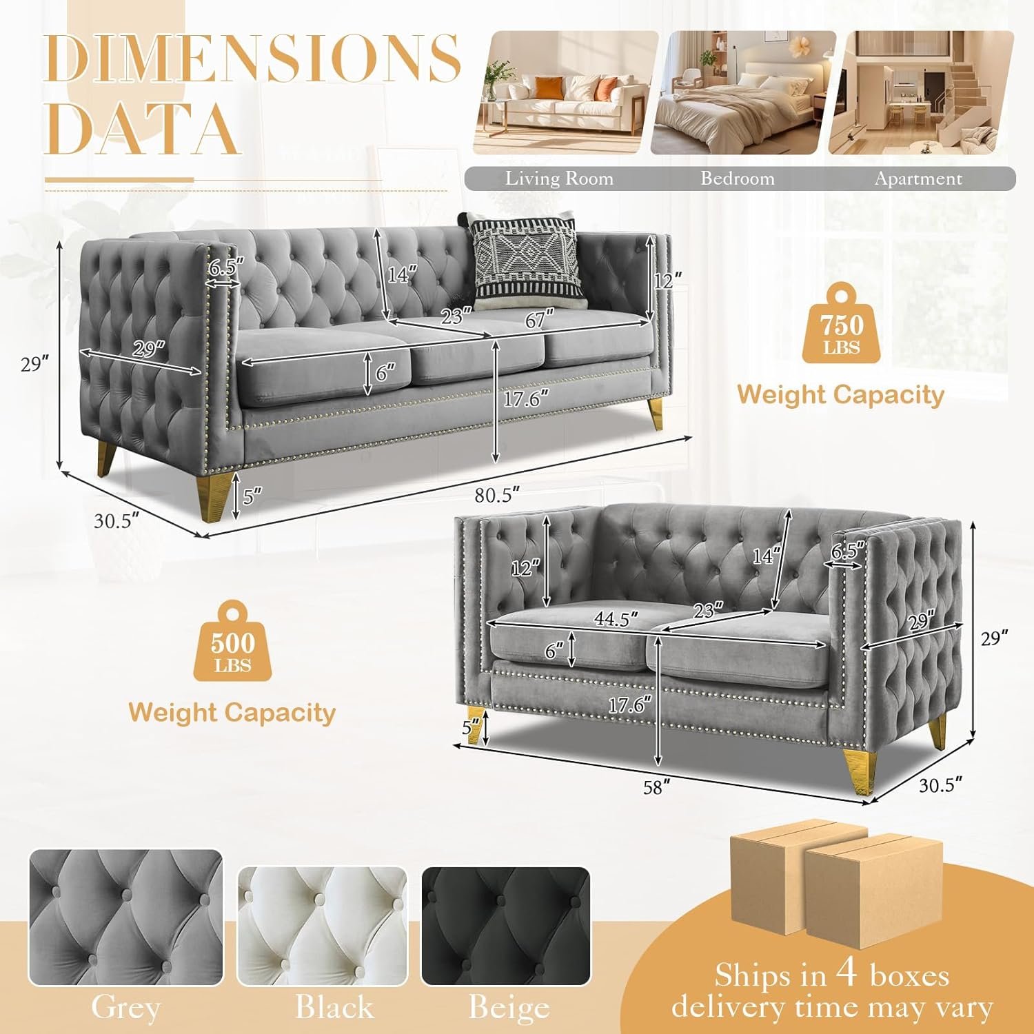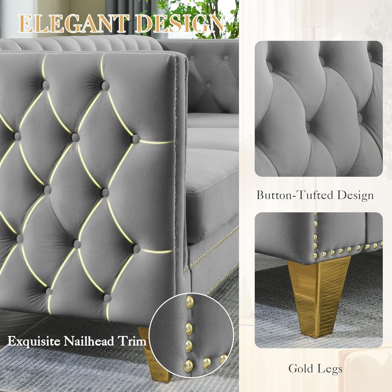 Chesterfield Sofa Set of 2, Modern Velvet Couch with Button Tufted & Nailhead Trim, Upholstered Deep Seat Couch, Comfy Sofa for Living Room, Bedroom, Apartment, Office(58″ W + 80.5″ W, Grey)
