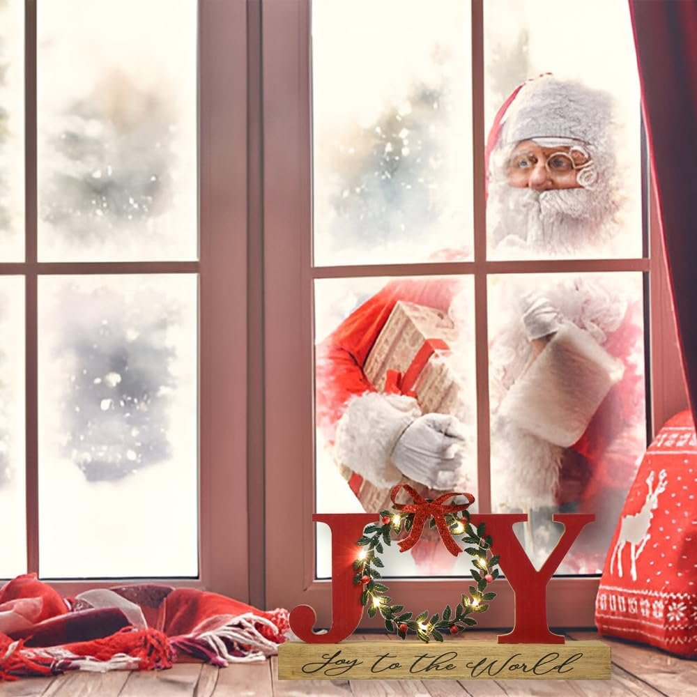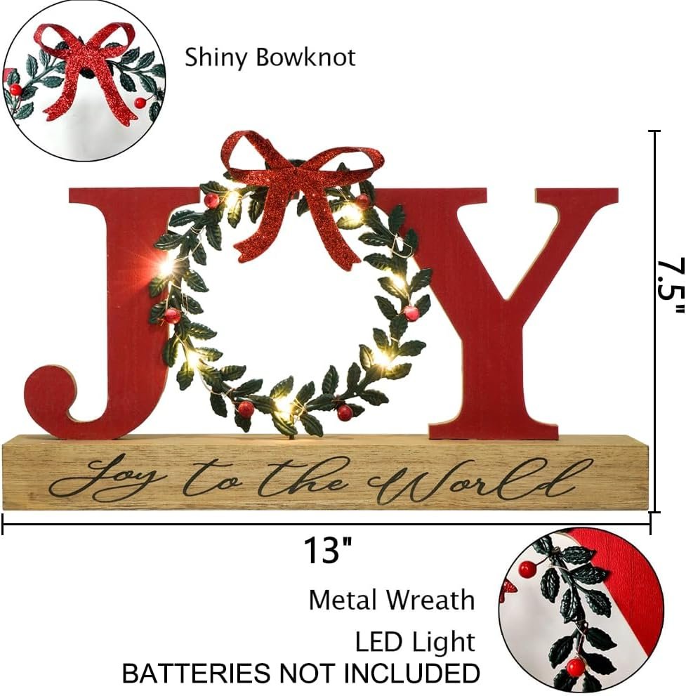 Christmas Decorations for Home LED Lighted Joy Sign with Timer Wreath Farmhouse Wooden Rustic Tabletop Decorative Sign Xmas Holiday Home Decor Indoor Room