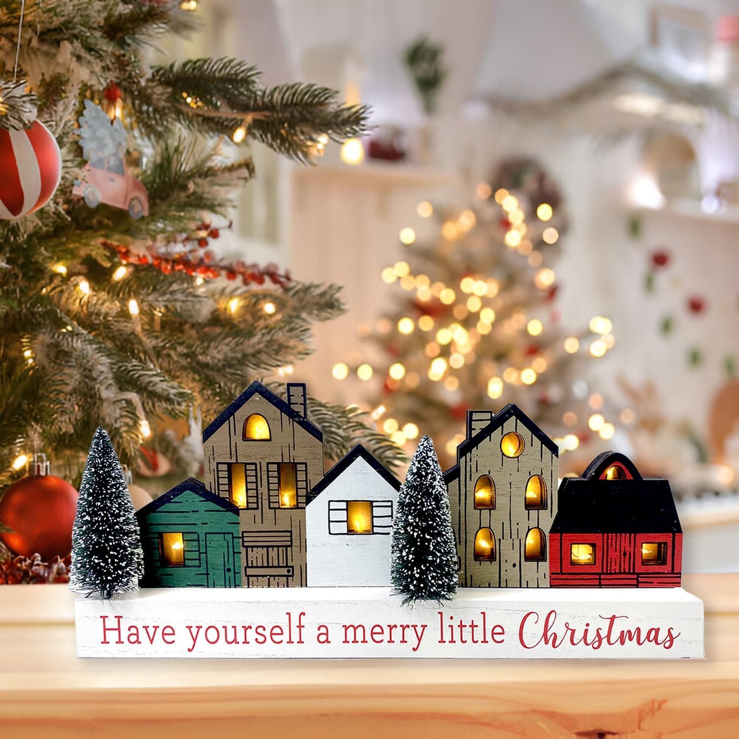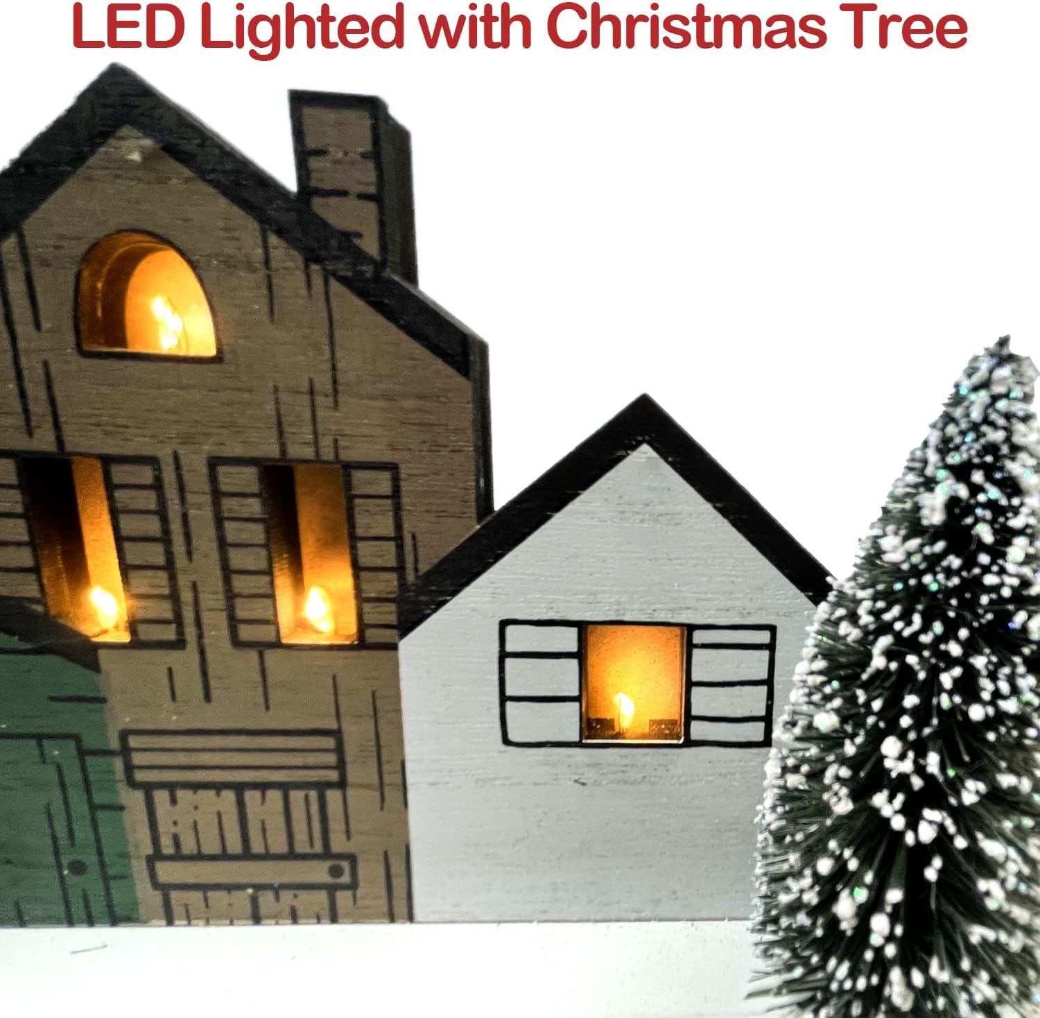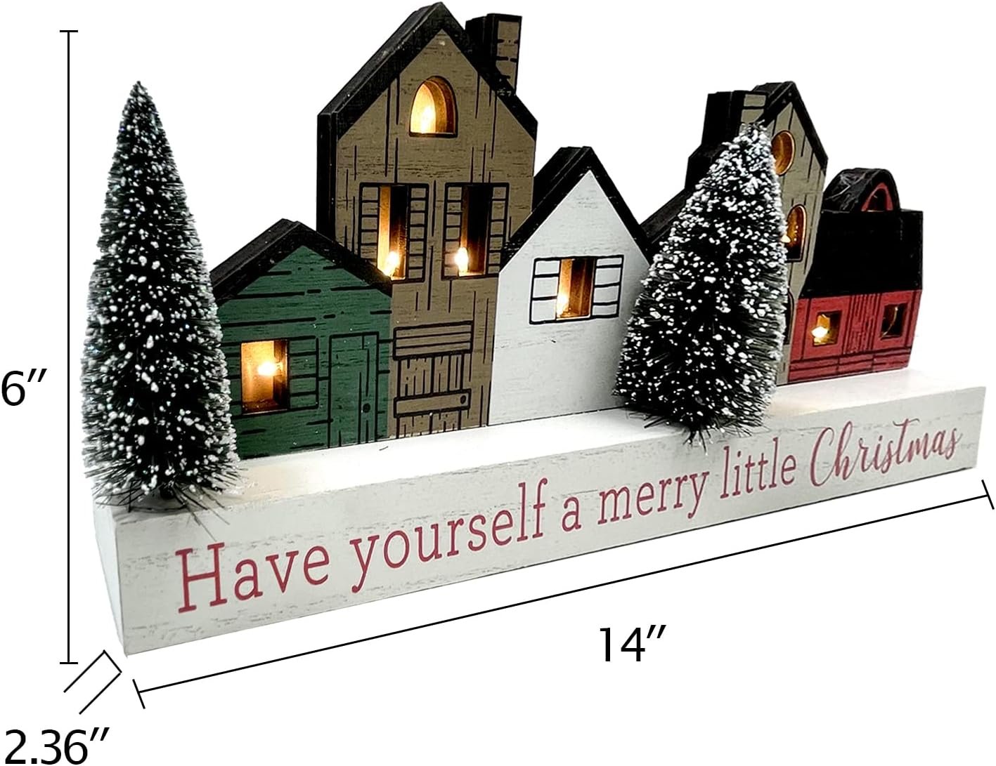 Such a cute decoration, but I have to leave the light feature off because they are SO bright. When they are turned on, you can’t even see the little houses anymore when you look at it because the glare of the lightbulbs is too overpowering. They should have made it with warmer/softer colored bulbs. Otherwise, if you keep the lights off, it is very cute still.