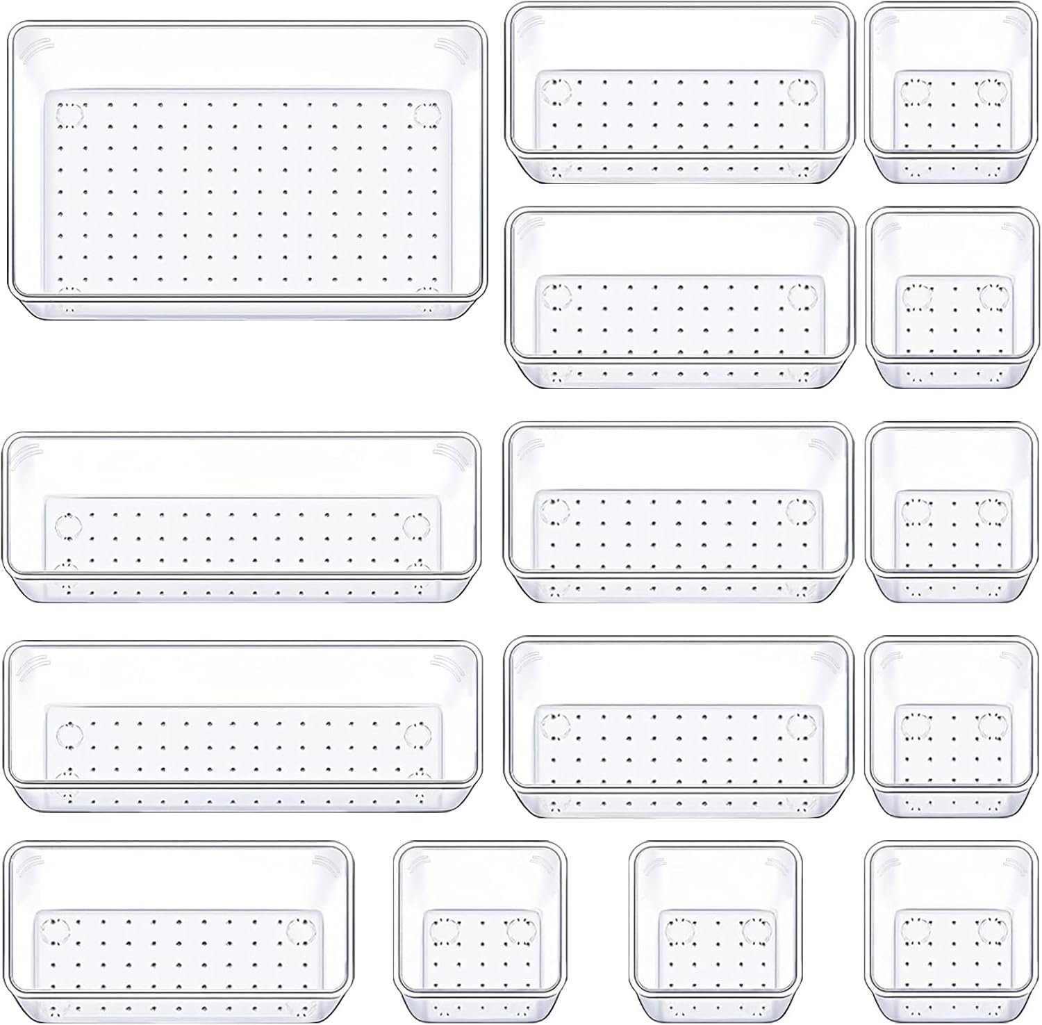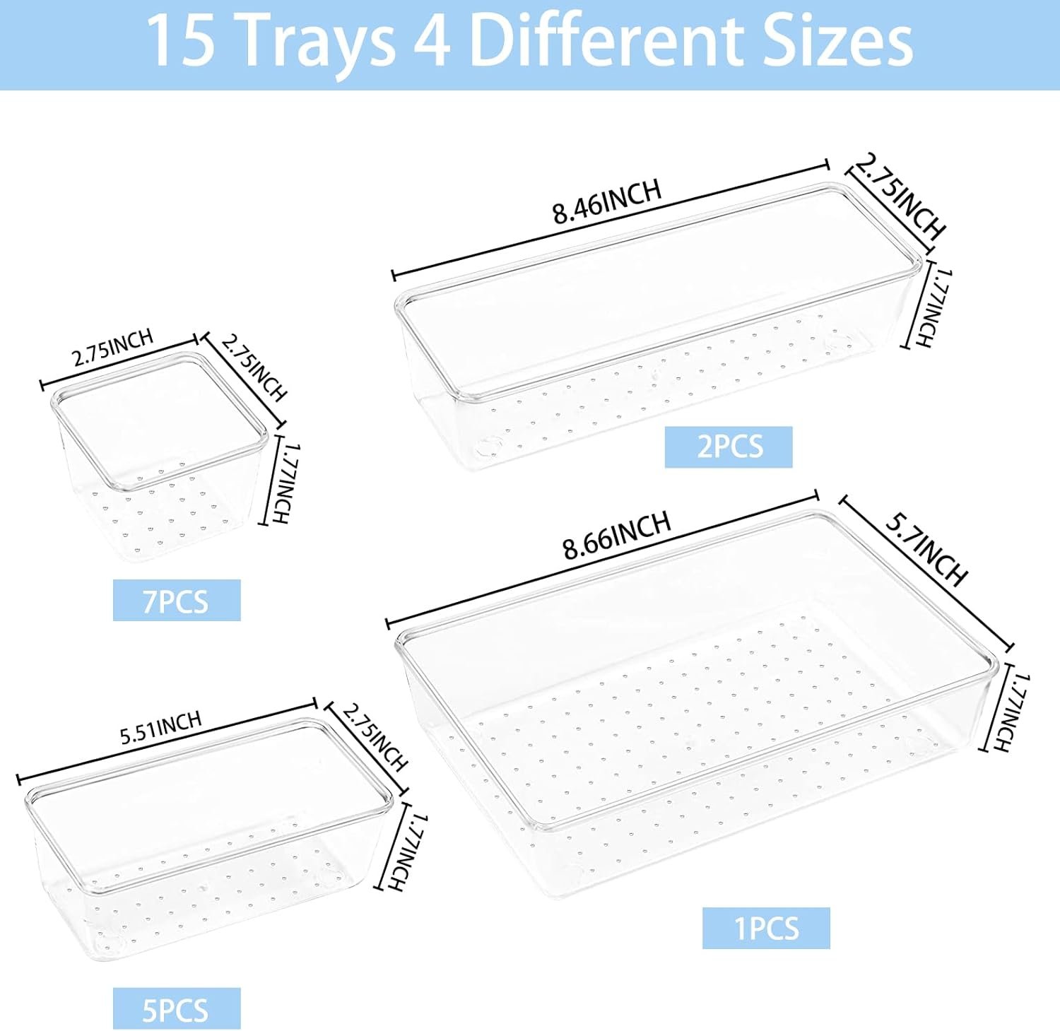 Drawer Organizers Set of 15, 4 Sizes Clear Plastic Drawer Organizers and Storage Bins for Kitchen, Bathroom, Office, Dresser Desk Drawer Organizer Tray for Jewelry, Makeup, Junk, Gadgets