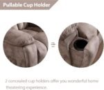 This is probably my favorite couch out of all the furniture I’ve purchased over the years. It’s pretty big for two people and it’s comfortable. The price for it is also really good considering most just like this couch go for wayyy more and there’s no need to break the bank for a good piece of furniture. Overall the quality is great and I highly recommend it so do my cats. lol. It does have a cup holder but I haven’t really used it, if you’re someone who does tho it is in a nice location because it goes back up when you’re not using it. You should 100% buy this couch.