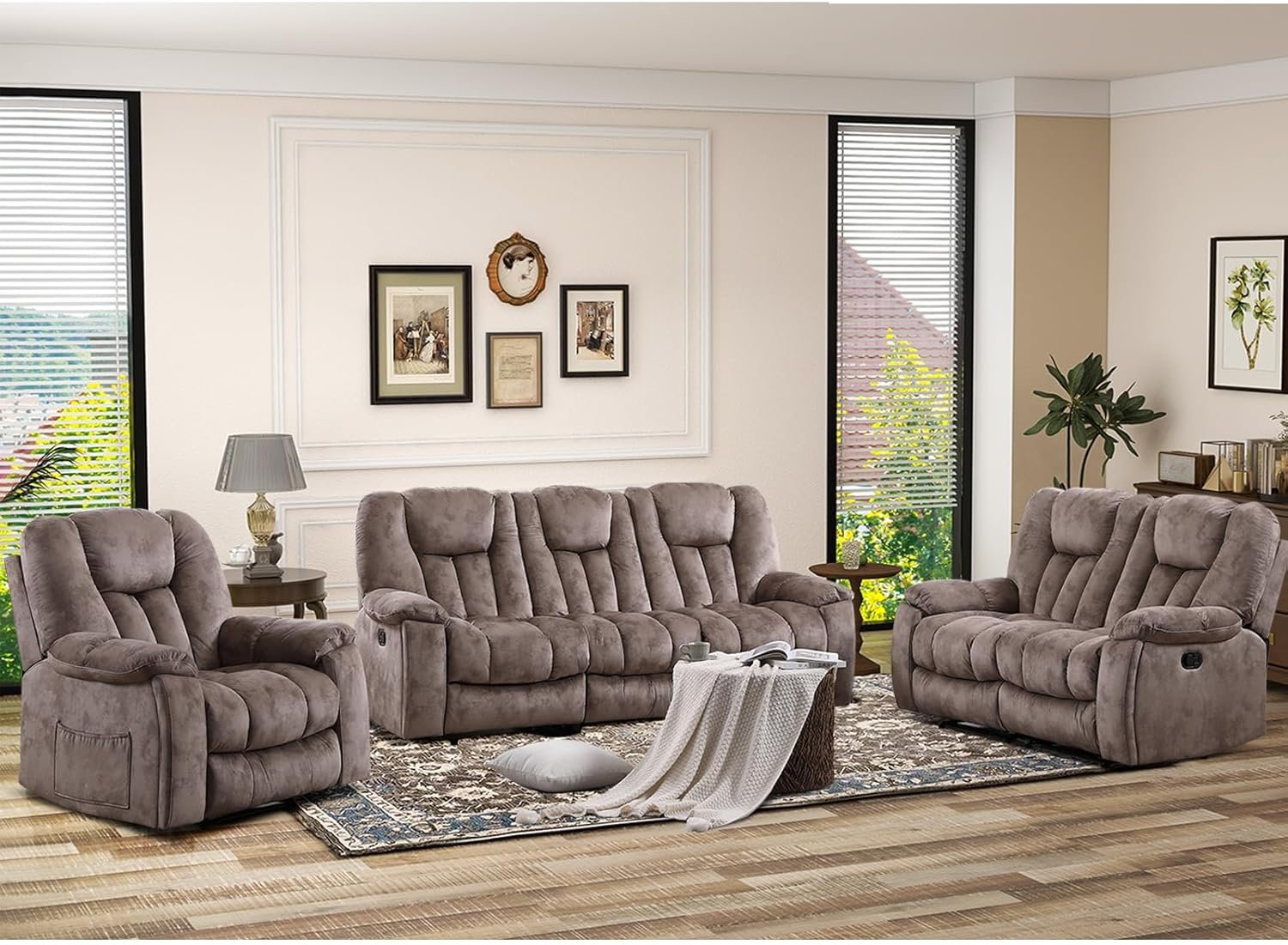 EBELLO 3 Pieces Recliner Sofa Furniture Set, Manual Recliner Chair with Massage and Heat, Loveseat and 3 Seat Reclining Couch Set for Living Room, Light Brown