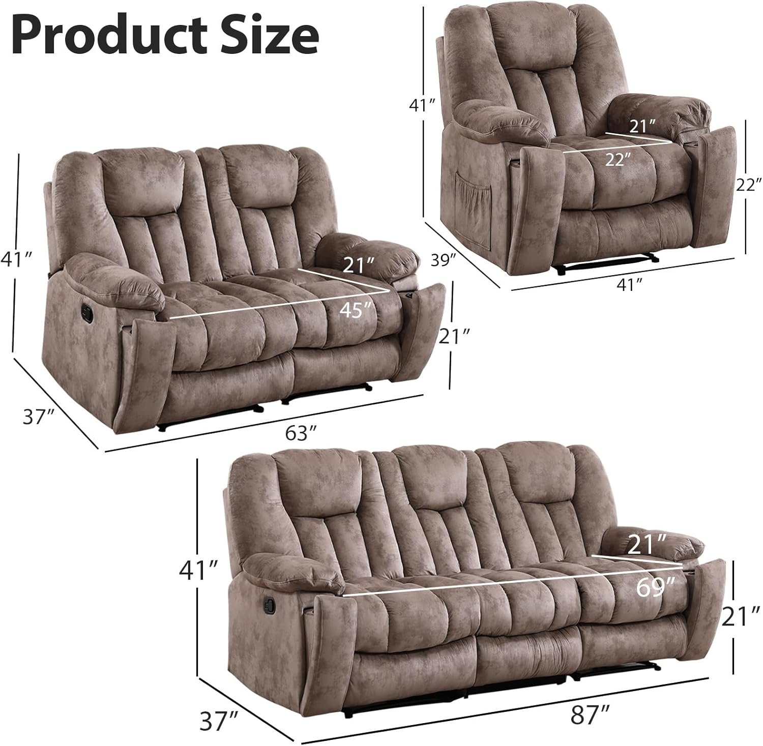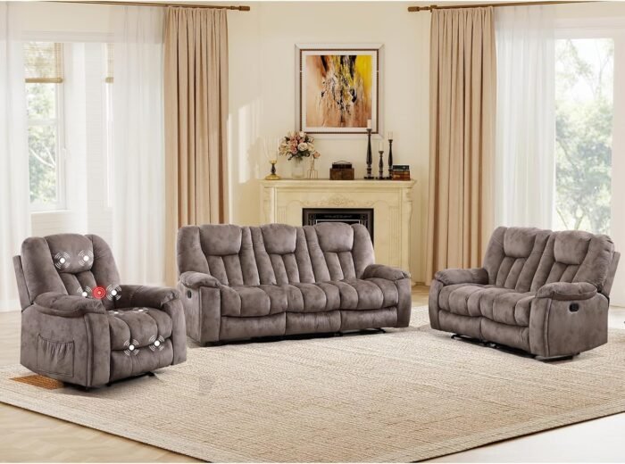 8 reviews for EBELLO 3 Pieces Recliner Sofa Furniture Set, Manual Recliner Chair with Massage and Heat, Loveseat and 3 Seat Reclining Couch Set for Living Room, Light Brown