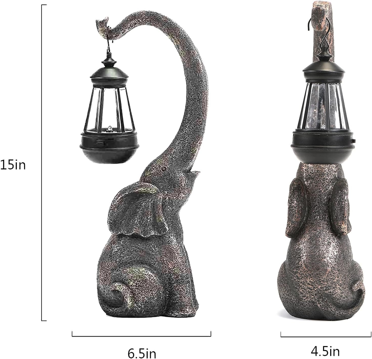 This elephant is just adorable. Like others have stated, the light in the lantern has its own mind. It worked the first night, then would work for a few minutes before turning off. The thing is, overall he is so cute! He was on sale, so I kept him. I did not put him outside as I could see where he would fall over in the first big wind. I wound up removing the lantern that came with him and replacing it with another one I purchased on Amazon. It works great and can be turned on and off–has a decent battery life. The biggest difference is the light color–the original is a bright white and the replacements are a yellow flickering light. Here is what I purchased: SHYMERY Mini Lantern with Flickering LED Candles,Vintage Black Decorative Hanging Candle, Battery IncludedSet of 6).