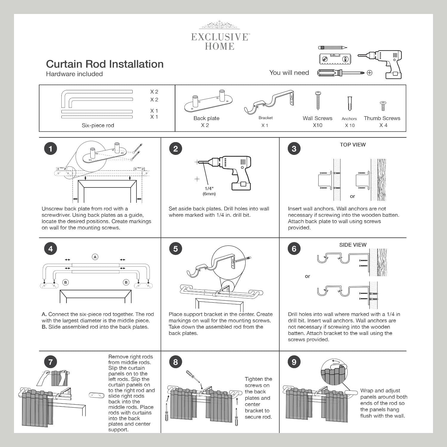 While the curtain rods have a nice aesthetic look the parts are poor quality and the instructions are incorrect. The toggle anchors turned with the screw in the drywall as we were attempting to screw them in, then the anchors broke. The instructions suggest using too large a bit to pre drill the holes leading to needing to buy larger anchors for a secure fit because we followed the instructions.