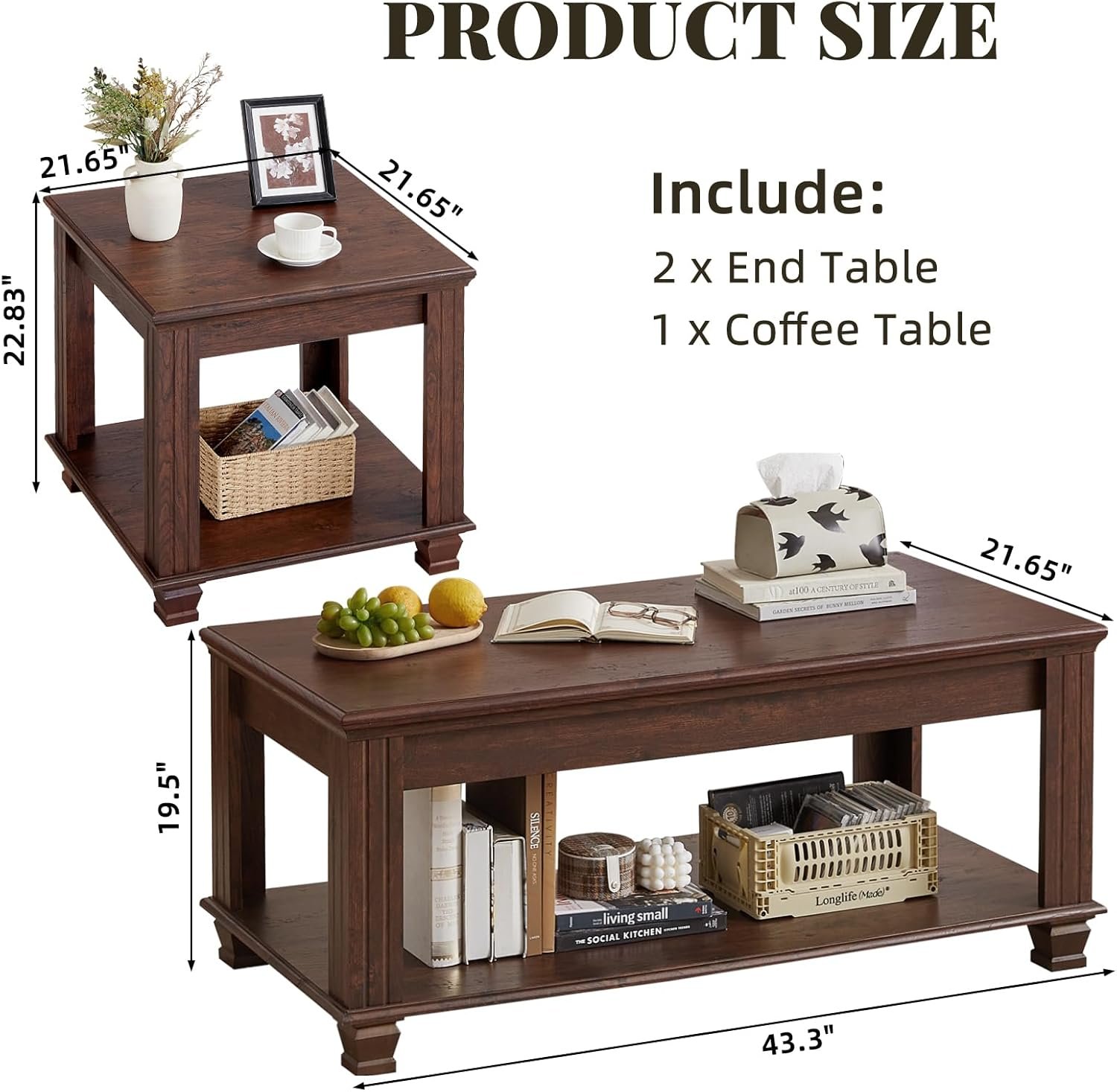 Farmhouse Coffee Table Set of 3,Rustic Wooden Living Room Table Set,Large Coffee/End Side Tables with Open Shelf for Living Room,Walnut