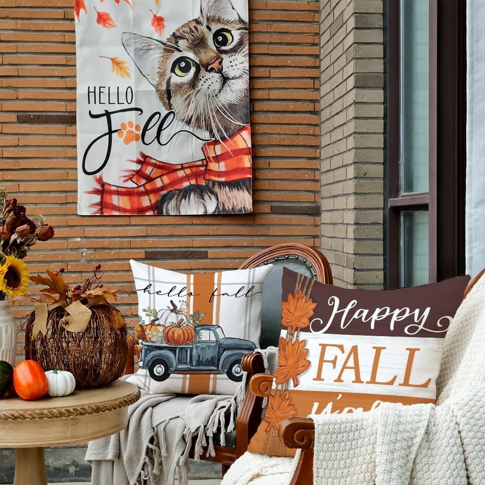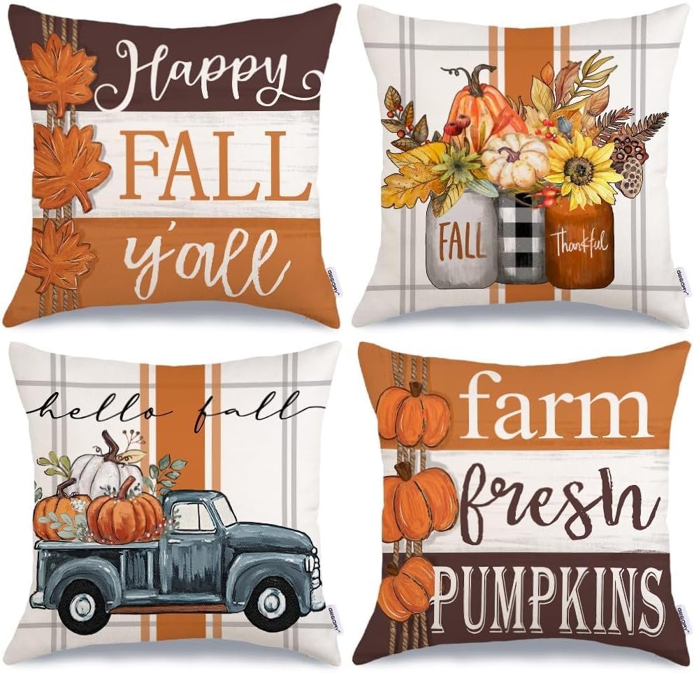GEEORY Fall Pillow Covers 18 x 18 Inch Set of 4, Happy Fall Y’all Stripes Pumpkins Mason Jar Thankful Decor, Cushion Cases for Farmhouse Home Party Sofa Couch (Brown) G355-18