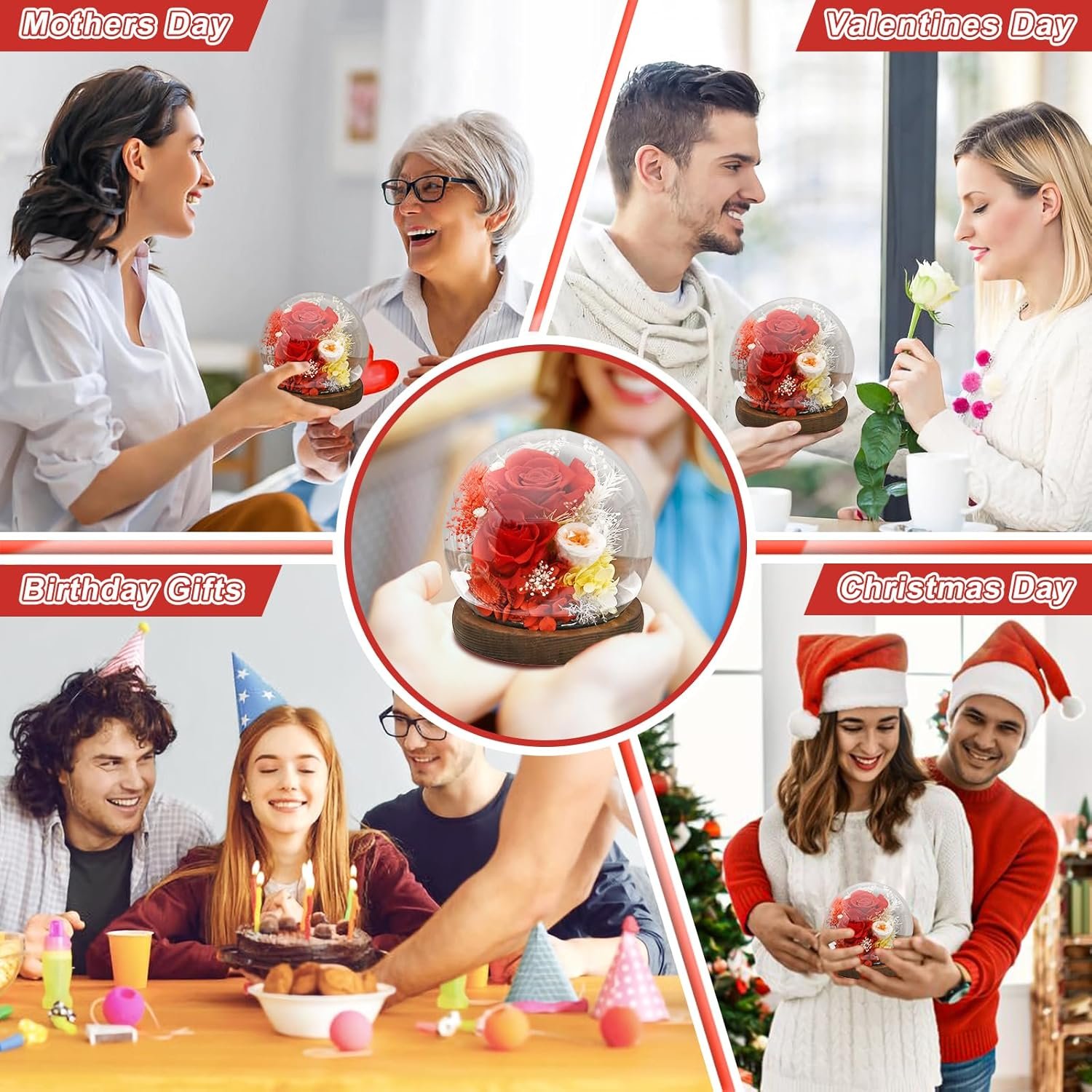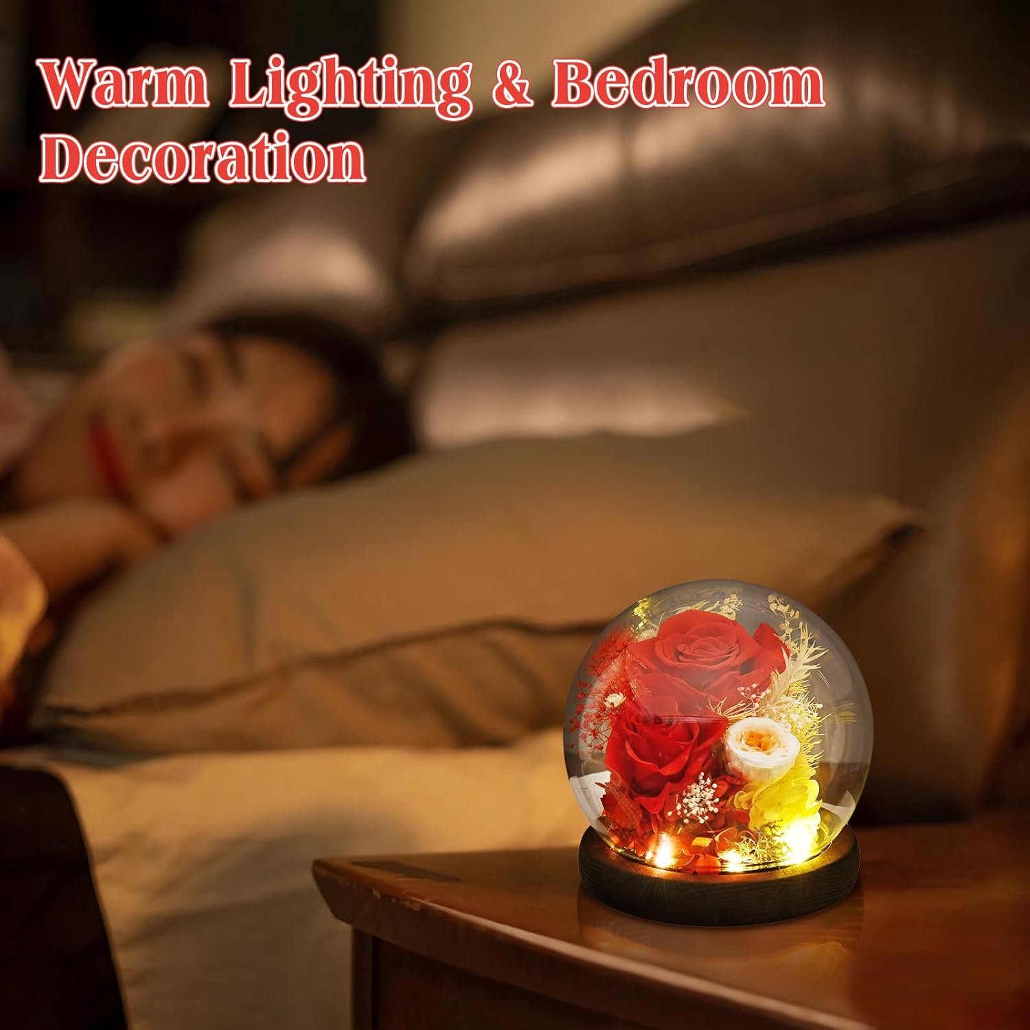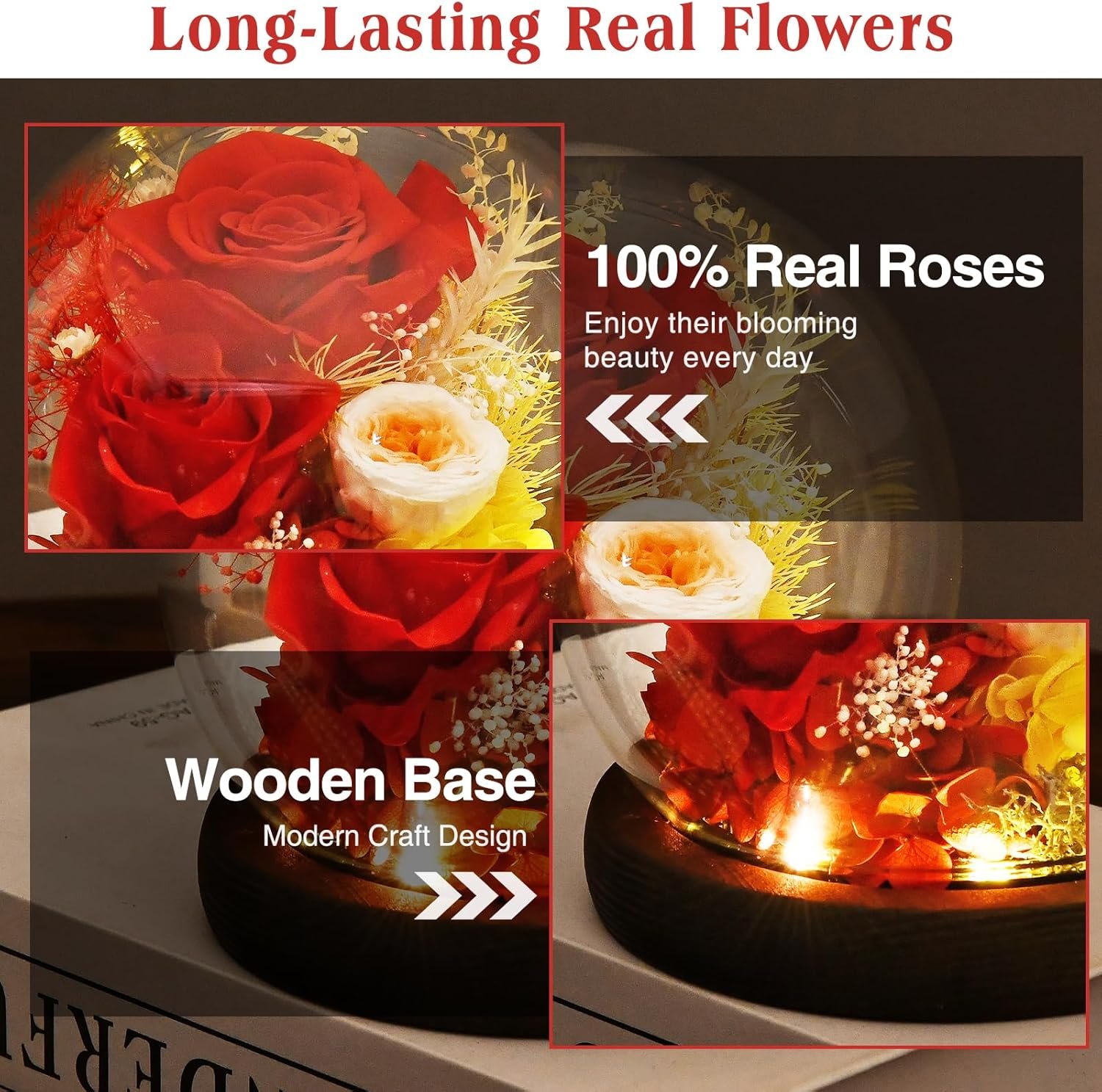 Gifts for Wome, Mom, Grandma, Wife, Preserved Rose Flowers in Glass Dome for Birthday Gifts, Christmas, Anniversary, Wedding, Thanksgiving, Mothers Day, with LED Light (Red)