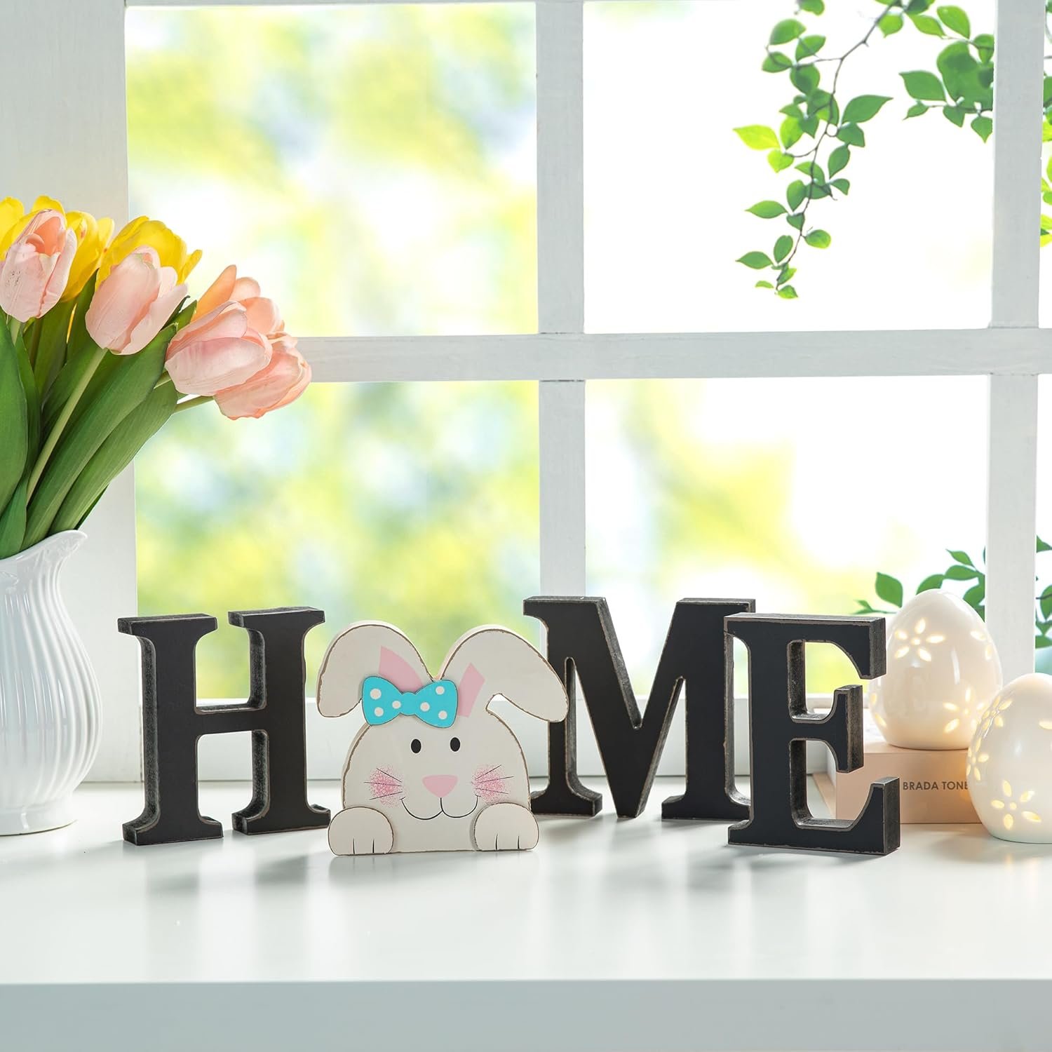 Glitzhome Interchangeable Home Sign with 10 Seasonal Icons Wooden Sign Table Top Shelf Decor for Holiday Farmhouse Door Welcome DIY Decor