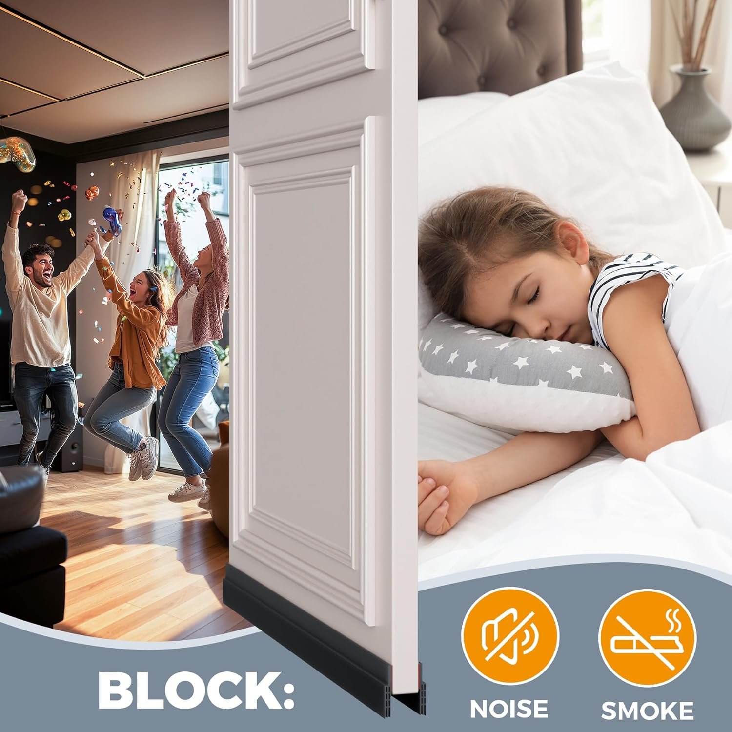 Very well designed product with so many add ons! I was pleasantly surprised that this came with so many tools to make sure the door guard is SECURELY stuck onto the door. They provide an adhesive and special tape to make sure the installation is successful.The seal is very strong, and the instructions are very clear. There is noticeable noise reduction from the product and the size is perfect! They give enough to ensure it fits YOUR door and I had to trim it down to my door size.