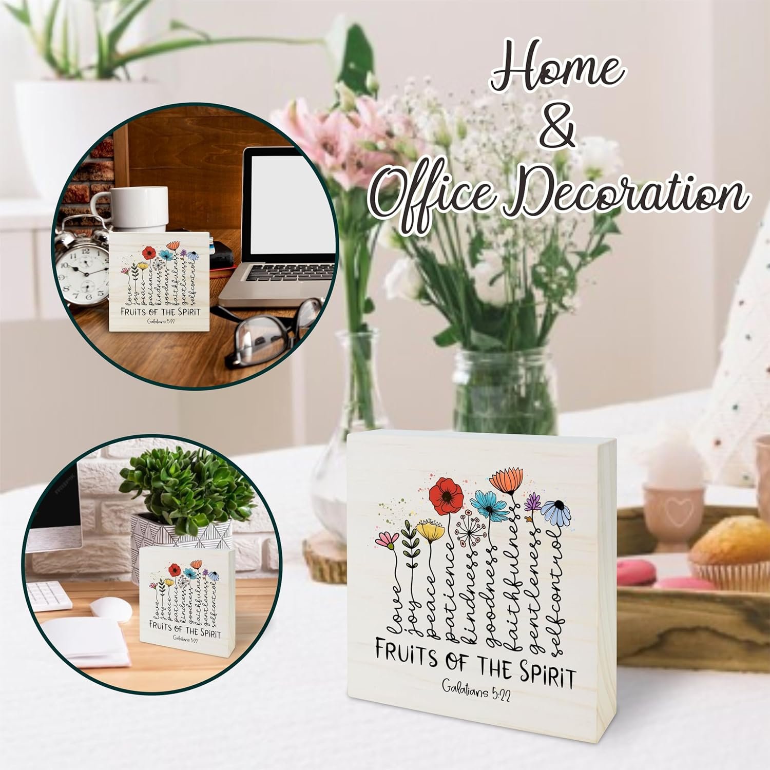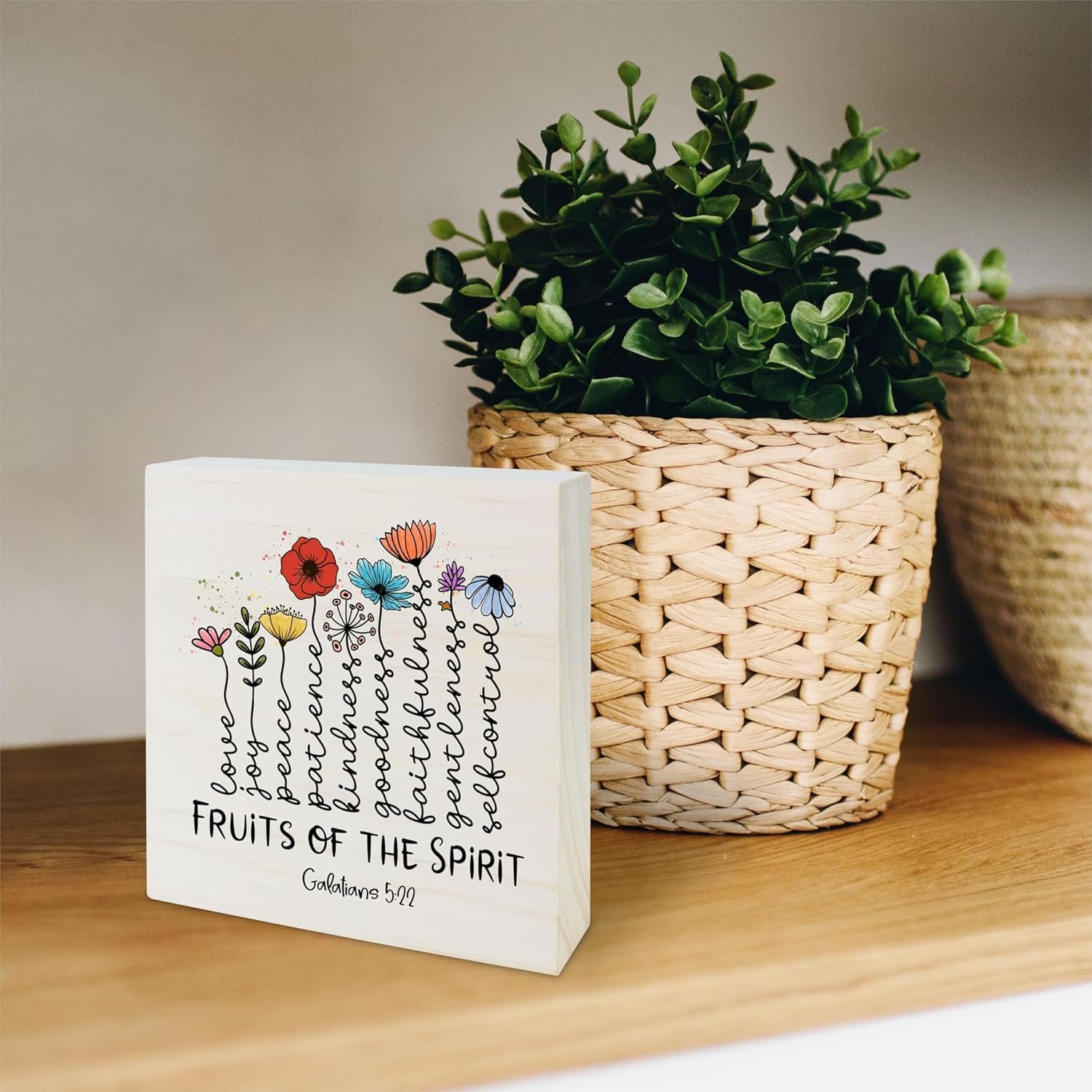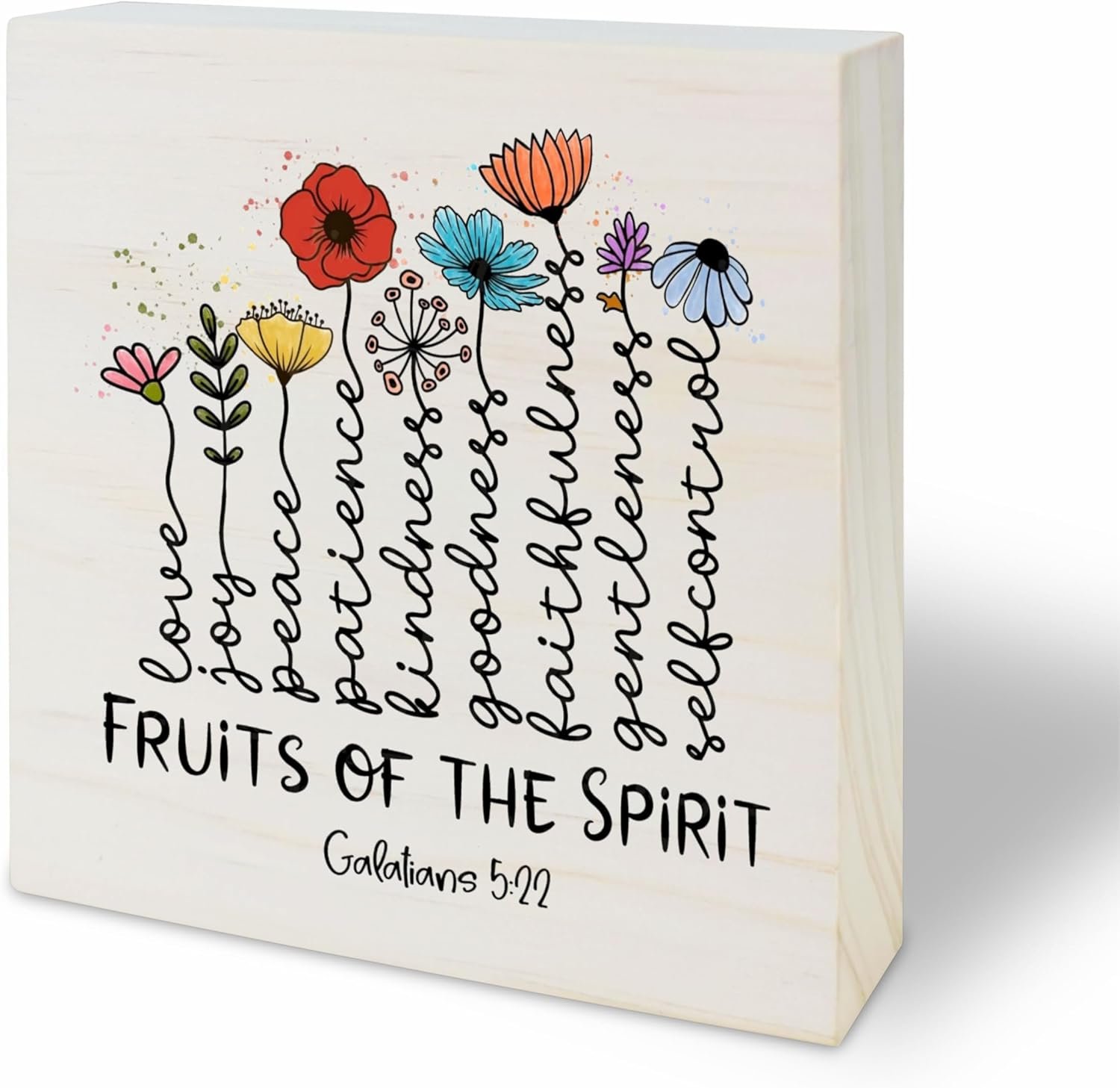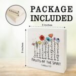Inspirational Saying Wooden Block – Fruits Of The Spirit – Watercolor Flowers Modern Farmhouse Tabletop Decor For Home,Office,Kitchen – 5 x 5 Inch Positive Wooden Sign – B01