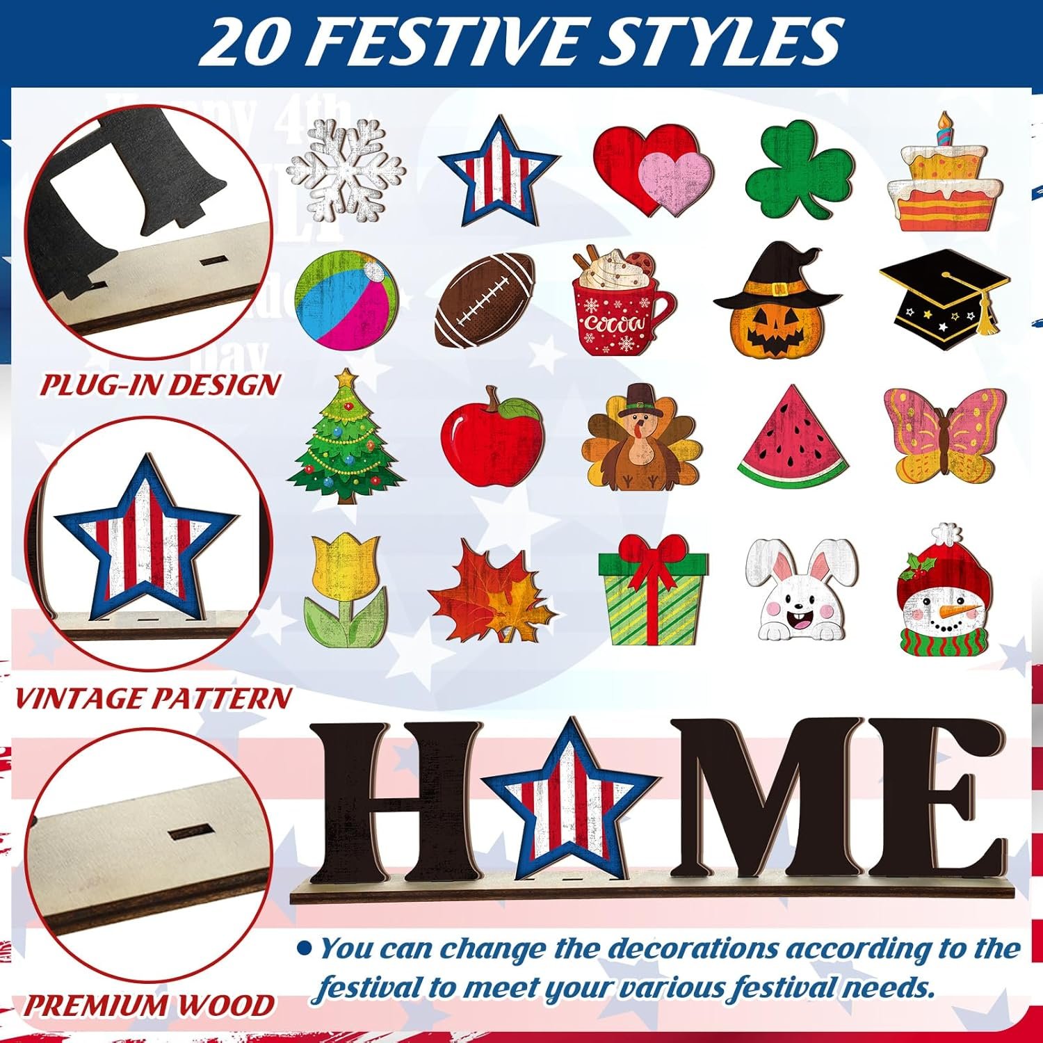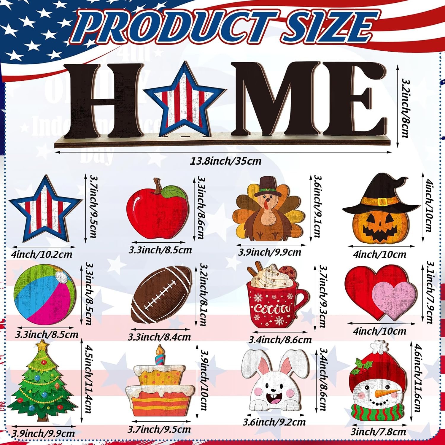 Tags: 4th, Decor, Decorations, Fall, Football, Graduation, Home, Icons, Interchangeable, July, Mantel, pcs, Seasonal, Seasons, Shelf, Sign, Summer, Tabletop, Windowsill, Wooden