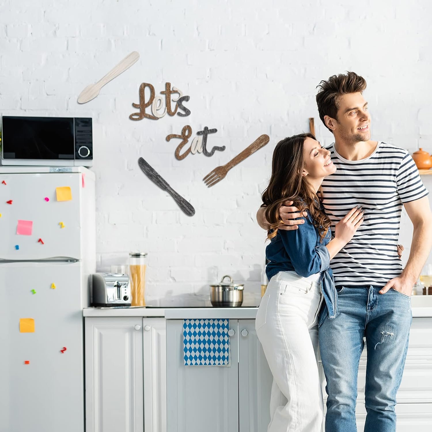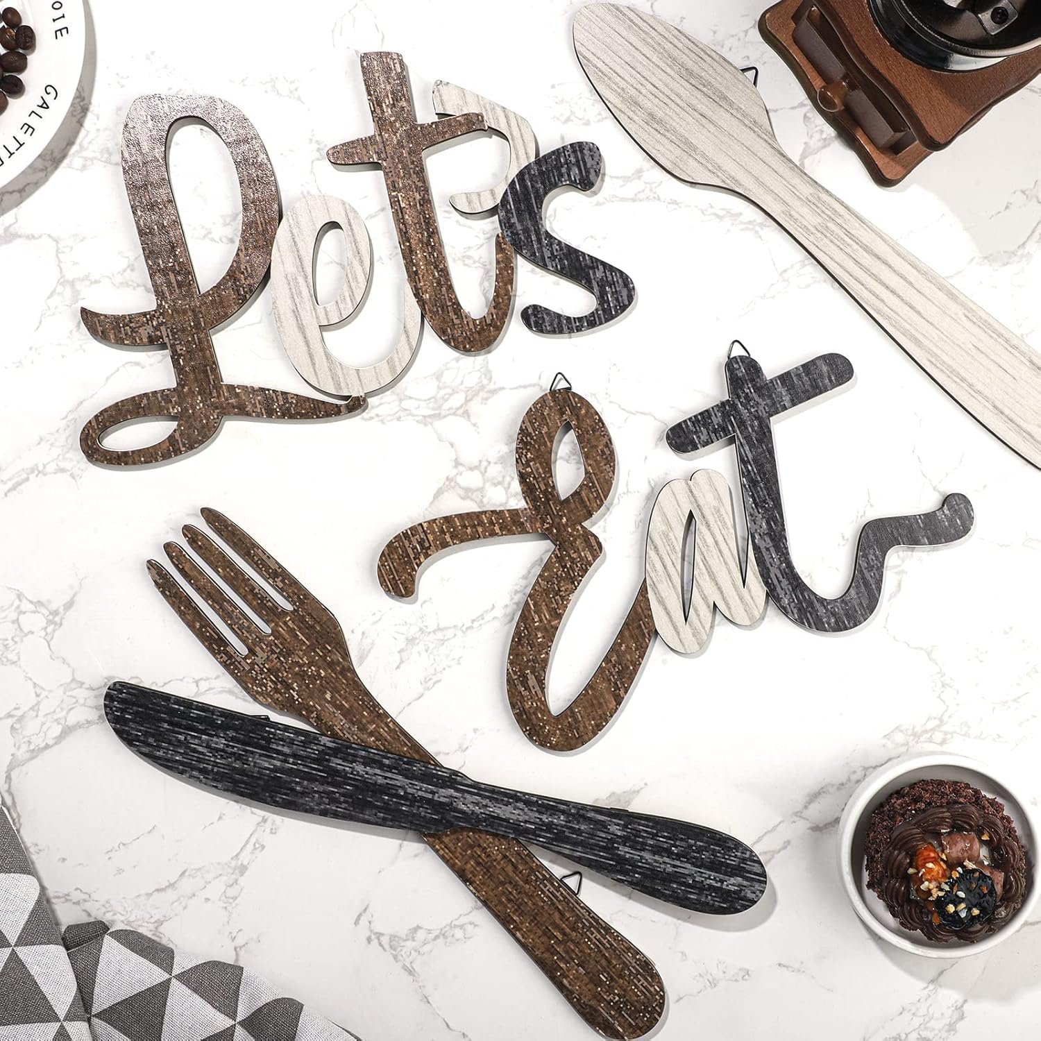 Jetec 5 Pcs Let’s Eat Sign Kitchen Wall Decor Fork Spoon Knife Kitchen Decor Sign Rustic Farmhouse Wooden wall decorations for Home Dining Room Bar Cafe Restaurant(Brown, Beige, Dark Gray)