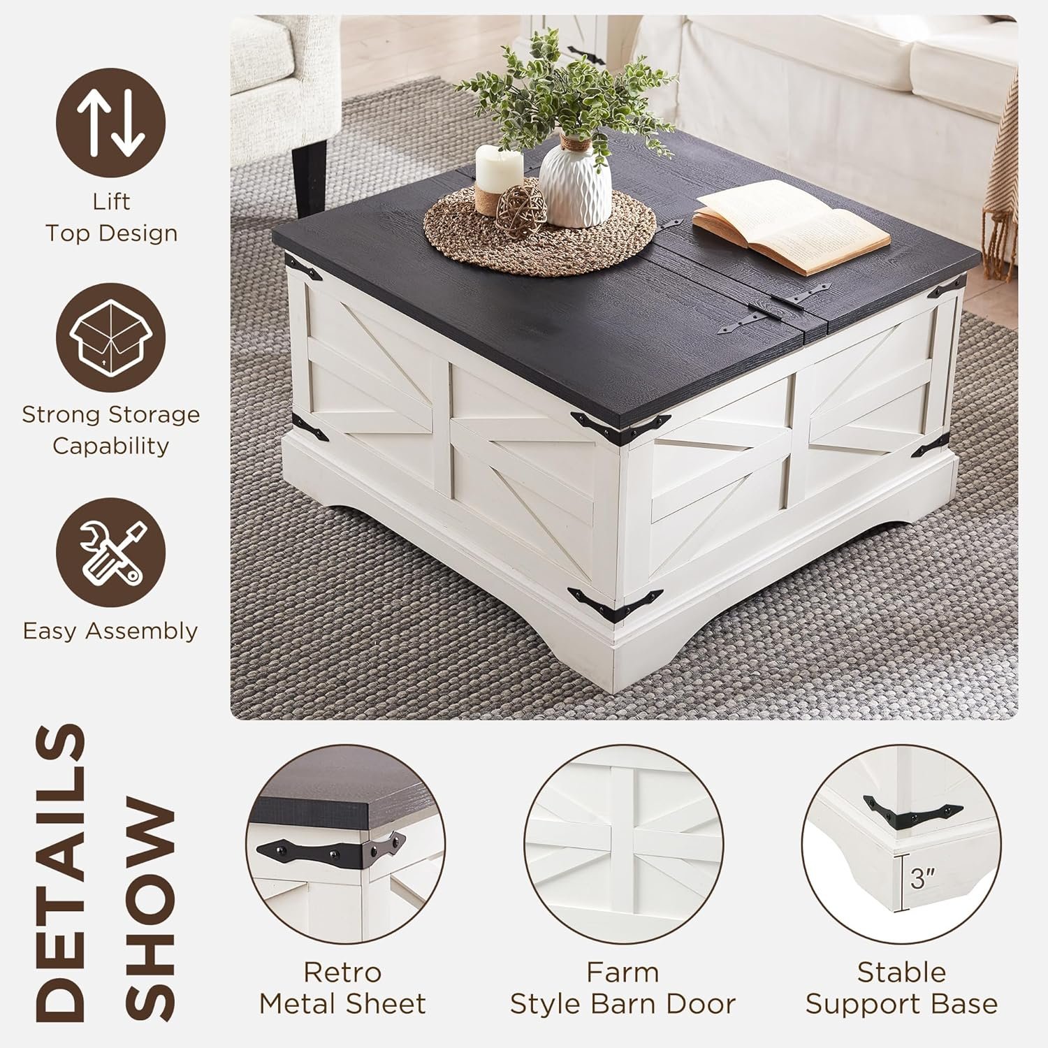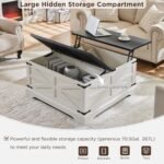 9 reviews for JXQTLINGMU Farmhouse Lift Top Coffee Table with Storage, 36″ Wood Square Center Table with Large Hidden Compartment, Rustic Lift Tabletop Dining Table for Home Living Room, White