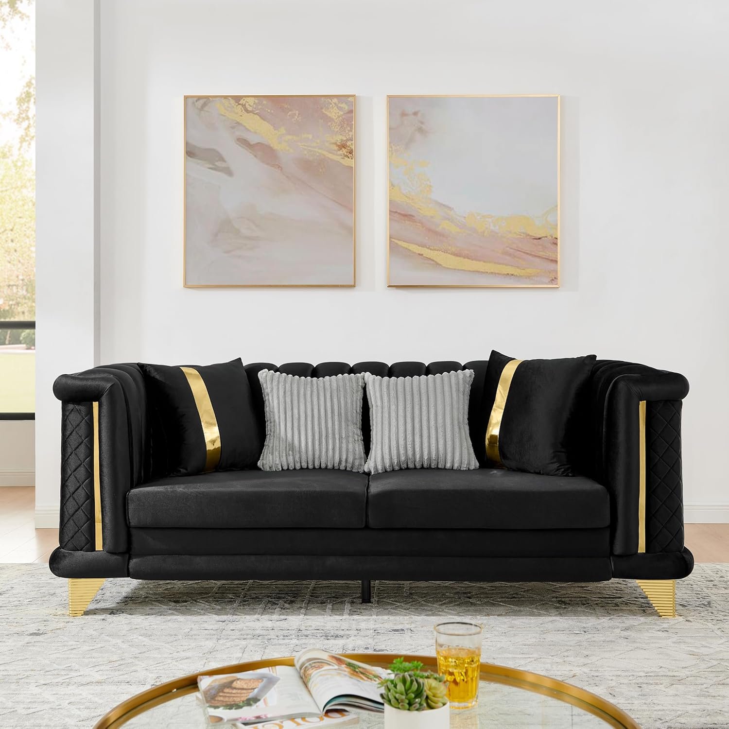 1 review for KEIKI 89″ Luxury Oversized Velvet Chesterfield Sofa with 4 Pillow, Gold Stainless Decoration and Embroidered Texture, 3-Seater Couch with Tufted Back, Rolled Arm, Easy Assembly, for Living Room, Black