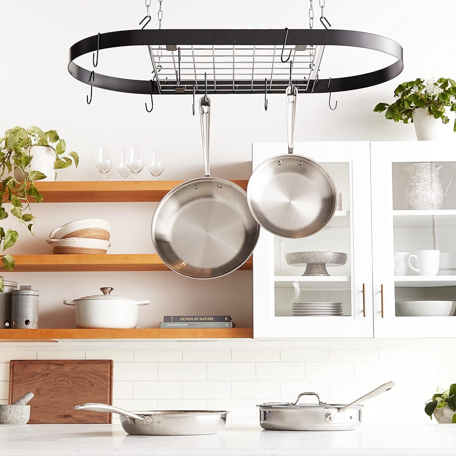 I didn’t look at a ton of pot racks, but this one seemed like a good deal. It comes with just about all the hardware you really need to install it (see note on installation below). It looks nice, has plenty of hooks, and seems sturdy.PROS:- clean lines, nice look- space and hooks for modest cooking needs (space for lids up top, hooks for pans, pots, and utensils below)- easy to installCONS:- the hooks that things hang from can get pushed up and off the rack as you lift off the pot or pan you wantIf you’re looking for a hanging pot rack that’s not too large, this is a great deal.NOTE on installation: As someone else pointed out, you have four points of attachment above, but you may not be able to find ceiling joists perfectly in line with these chains. I used a nicely milled 2x4s mounted perpendicular to the joist. I angle cut the ends to make them nice, then drilled two 3″ screws through the 2×4 into the joists. Finally I mounted the pot rack to the 2x4s. Perfect!