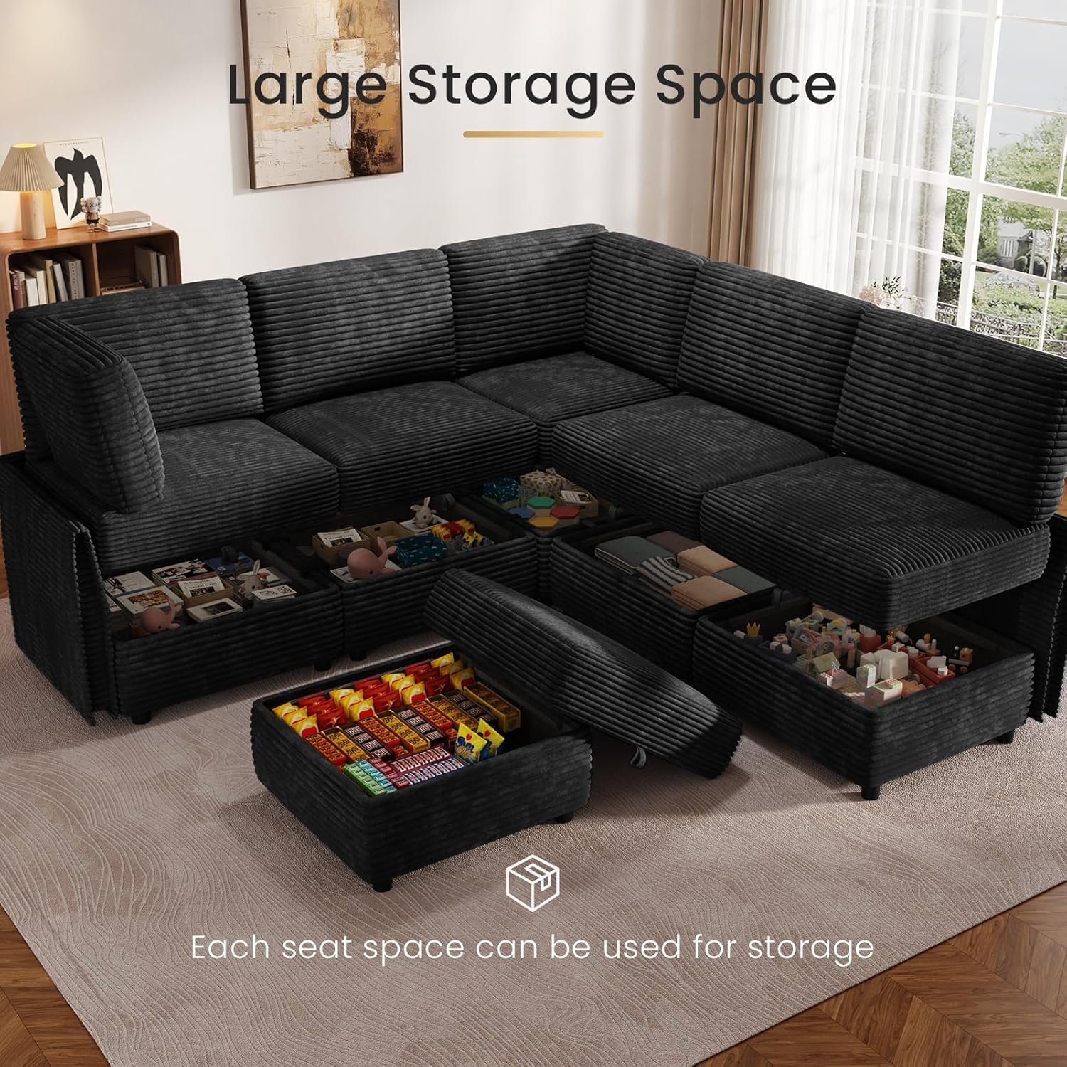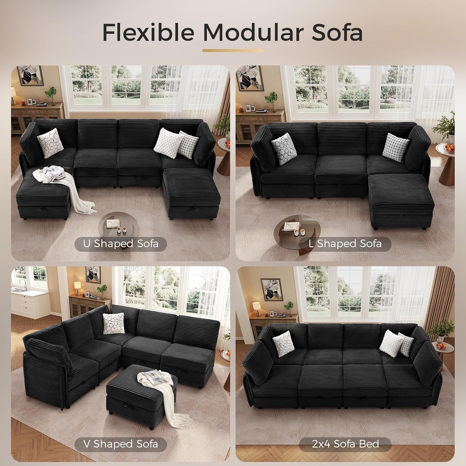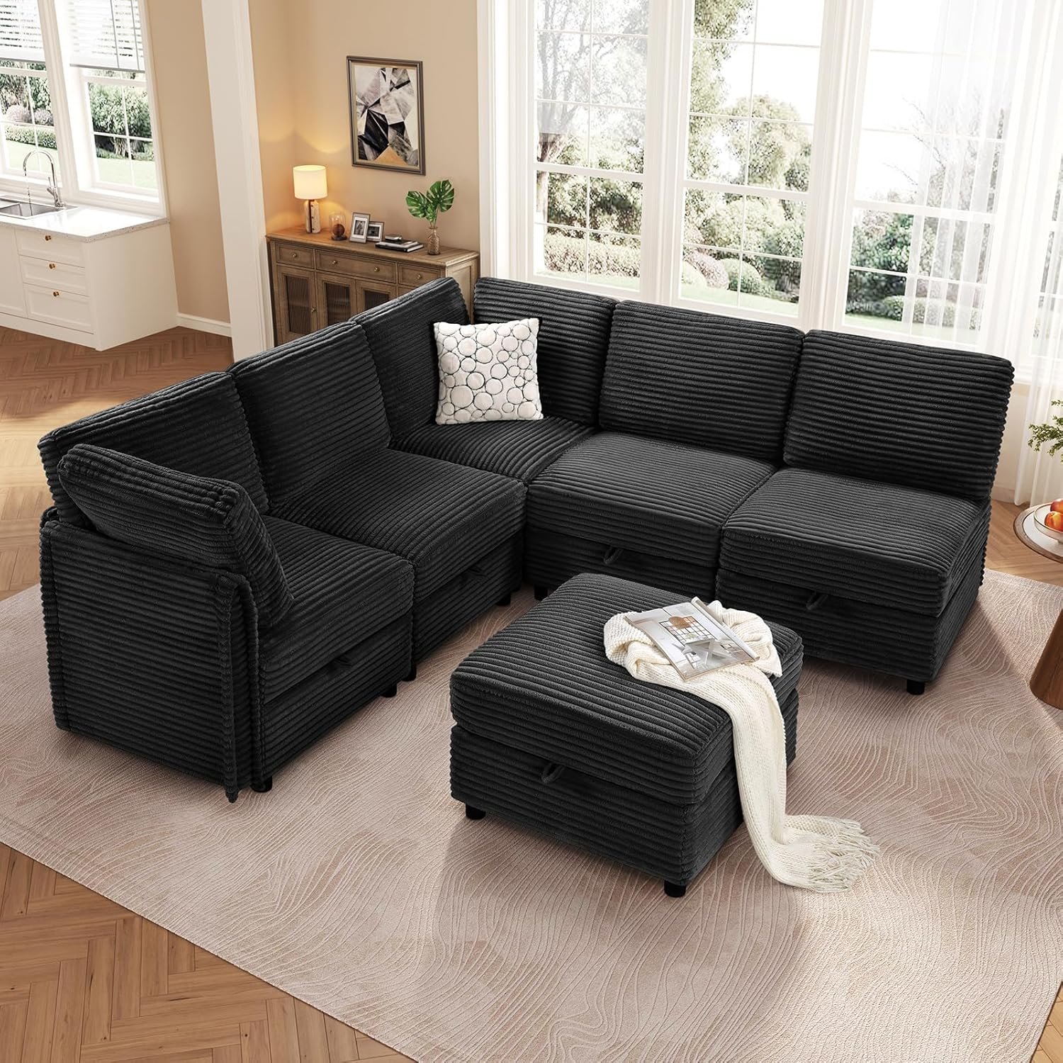 KKL Modular Sectional Sofa V-Shaped 6 Seater Couch with Storage Ottoman, Convertible L/J-Shaped Couch and Sofa Bed Plush Wide-Wale Corduroy for Living Room, Apartment, Modern Design, Black