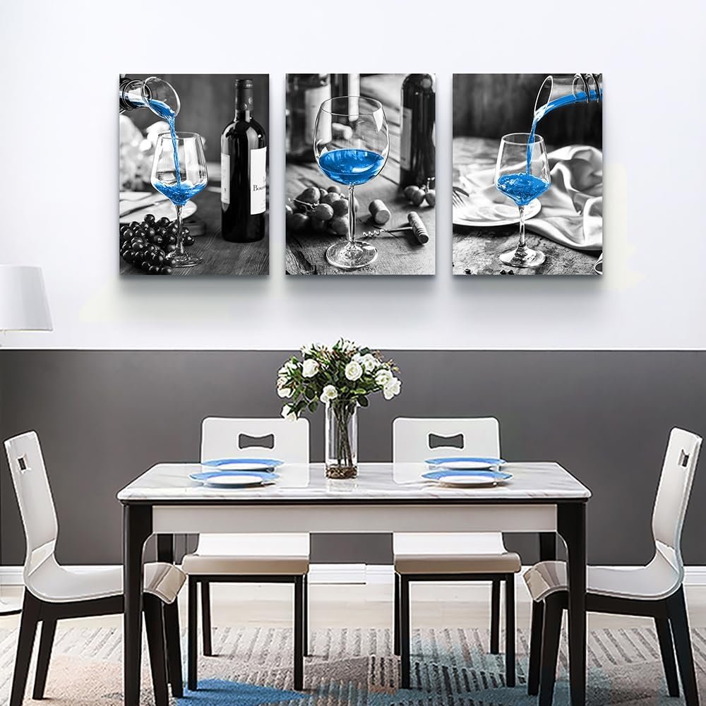 Lapremoly Canvas Wall Art – Modern Kitchen & Dining Room Decor – Black & White Wine Glasses, Blue Wine Wall Pictures – 3 Pieces
